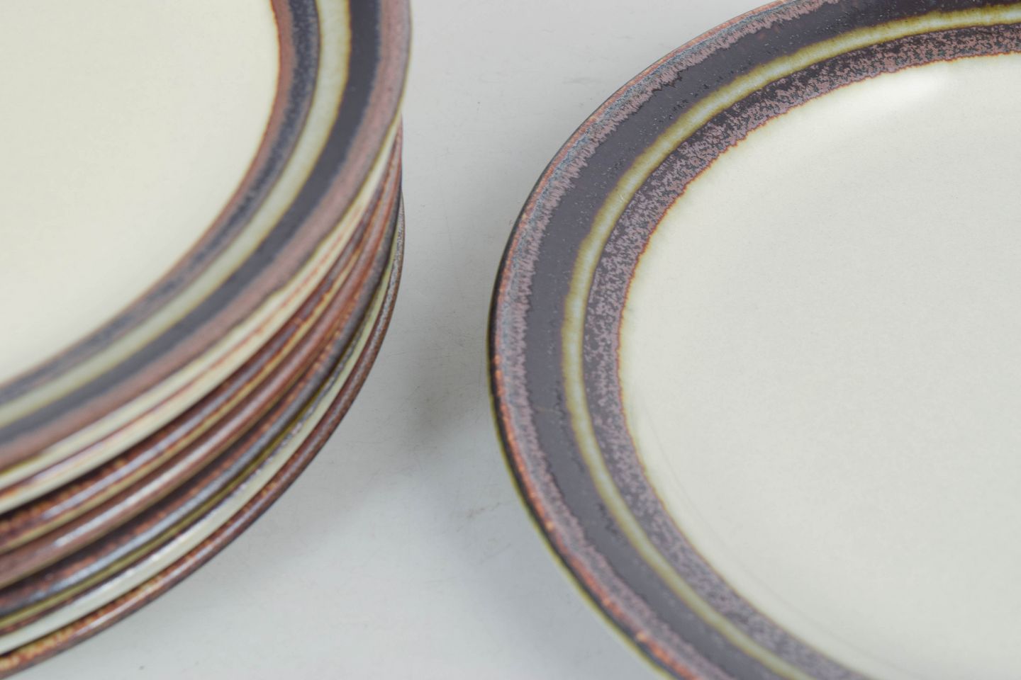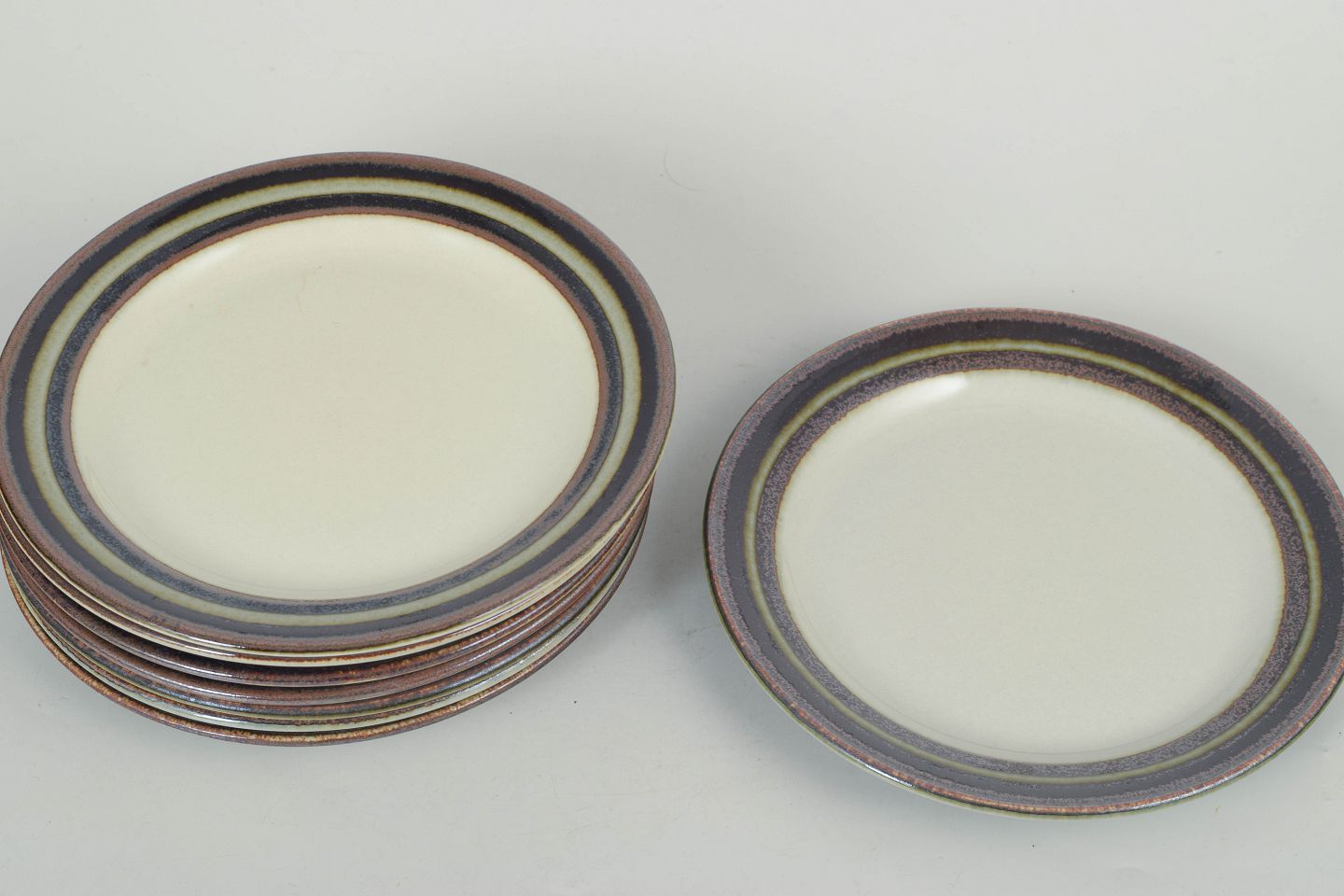 Klassiske tallerkener i stentøj med karakteristisk stribet kantdekoration i brune, grønne og mørke toner, model Karelia fra Arabia.