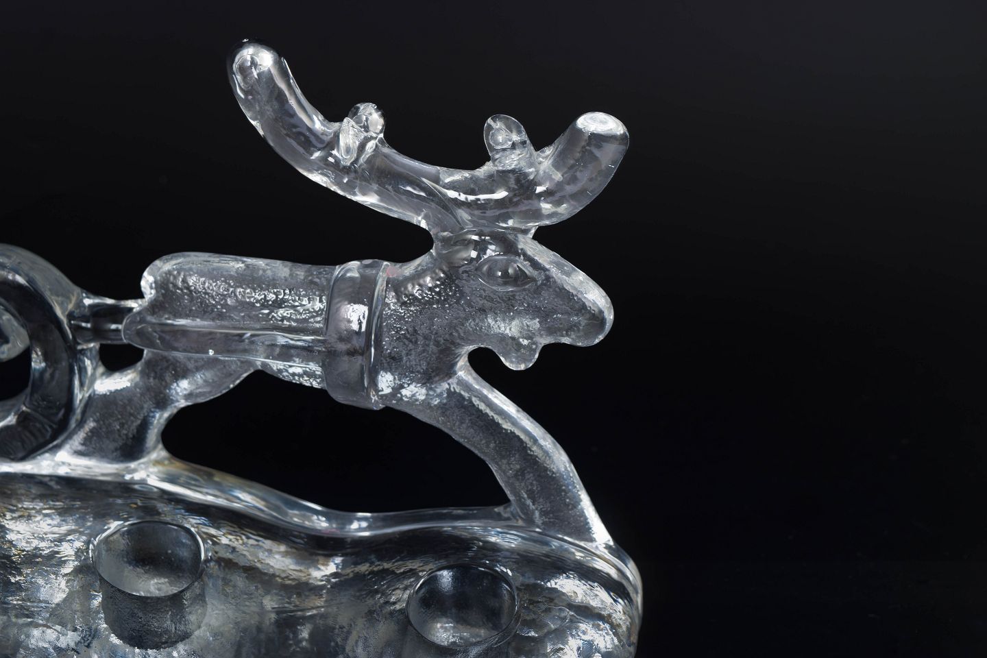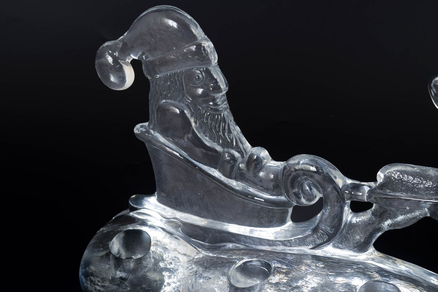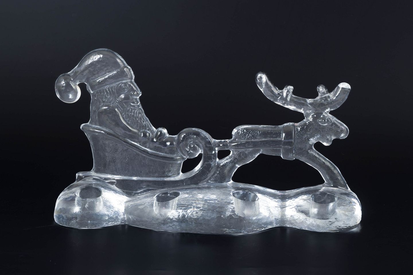 Dekorativ lysestage i klart glas udført som julemotiv med julemand i kane trukket af rensdyr. Designet som adventslysestage med plads til fire lys.
