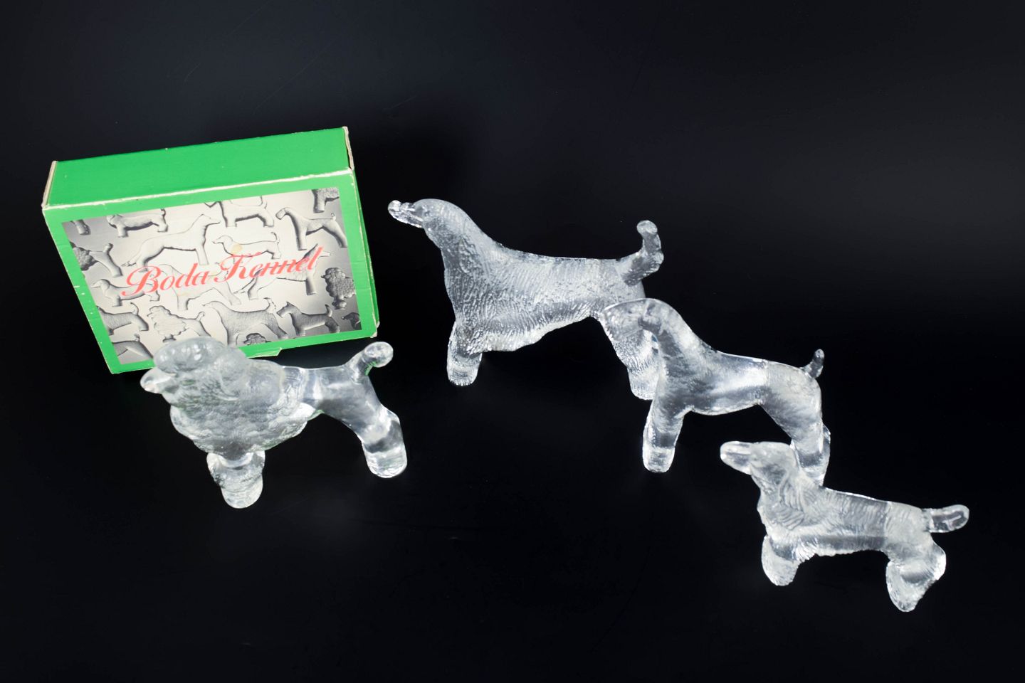 Sæt af fire skulpturelle hundefigurer i klart kunstglas med struktureret overflade, formgivet af Bertil Vallien for Kosta Boda. Figurenes organiske former og lette mattering giver et levende og karakterfuldt udtryk. Én med original æske.