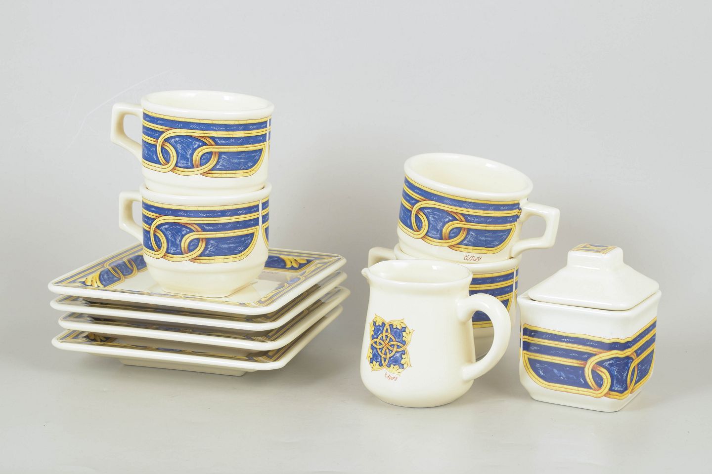 Tiffany Boutique, sæt af fire kaffekopper med underkopper, sukkerskål og flødekande.