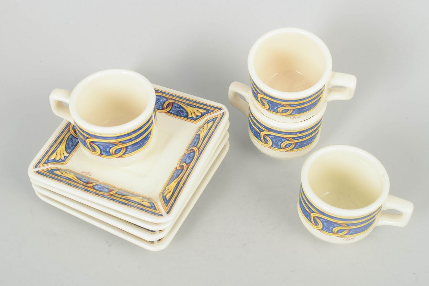 Dekorativt sæt i keramik bestående af fire espressokopper med tilhørende underkopper, dekoreret i blå, gule og gyldne toner med ornamentale mønstre.