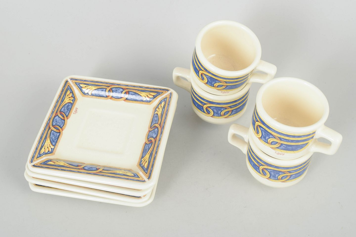 Dekorativt sæt i keramik bestående af fire espressokopper med tilhørende underkopper, dekoreret i blå, gule og gyldne toner med ornamentale mønstre.