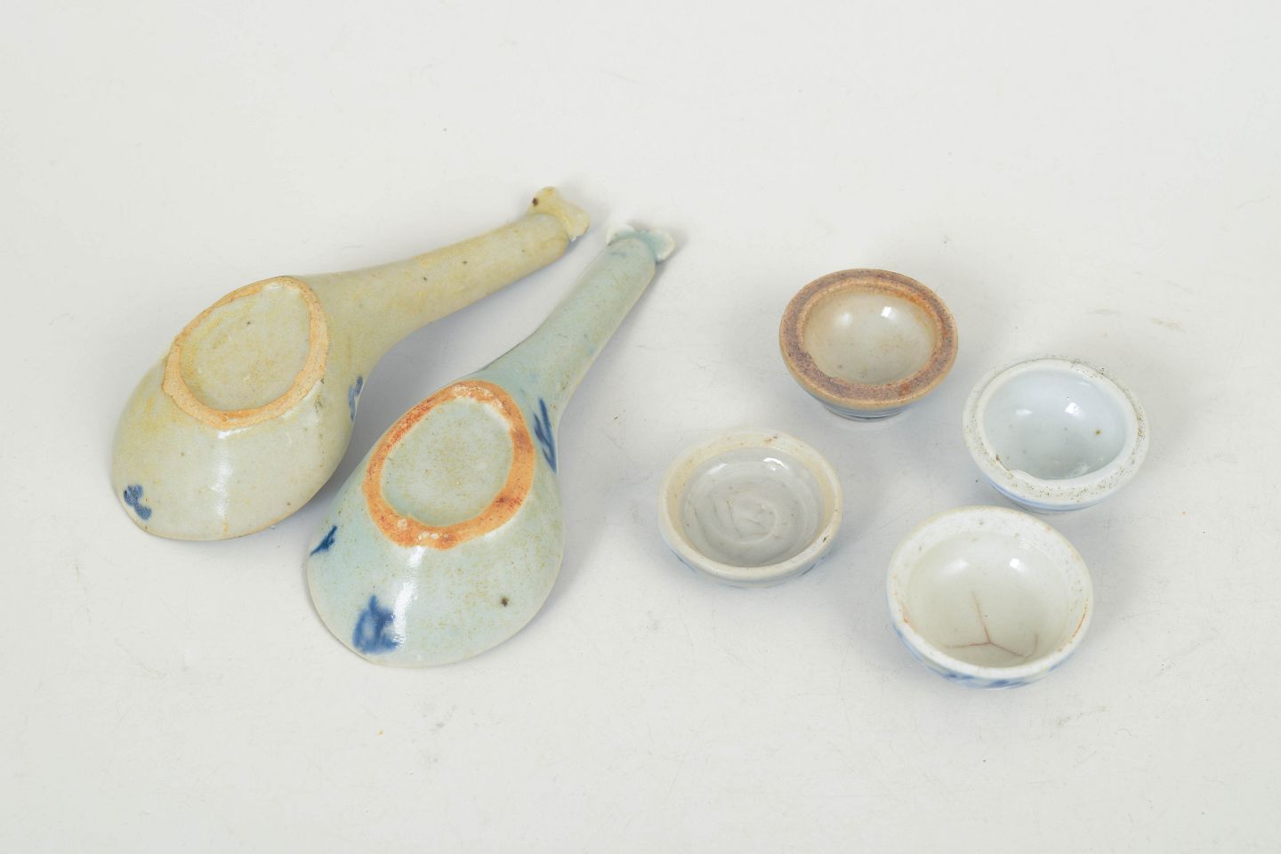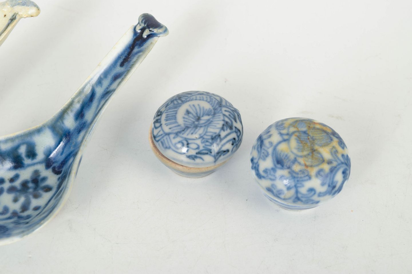To porcelænsskeer med blå underglasurdekoration fra Qing-dynastiet samt to små lågæsker i porcelæn med blå dekoration, ligeledes fra Qing-perioderne, udført i klassiske former.