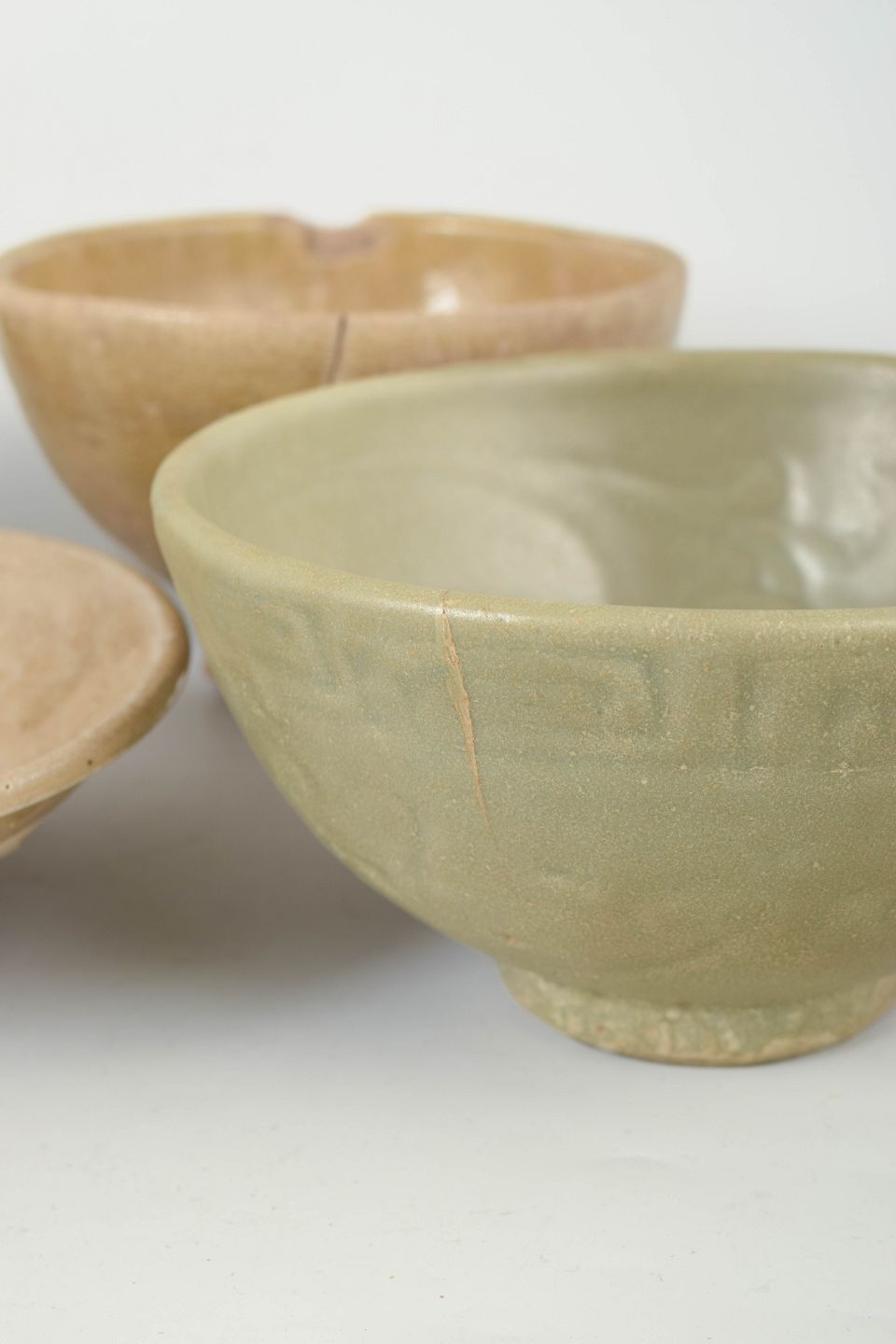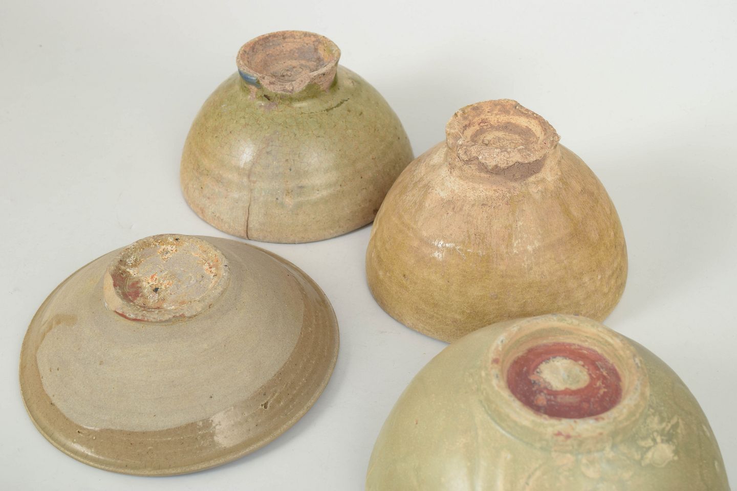 Fire hånddrejede keramiske skåle med varierende glasurer, herunder celadon og jordfarvede toner, med synlige spor af alder og brug samt traditionelle former fra perioden.