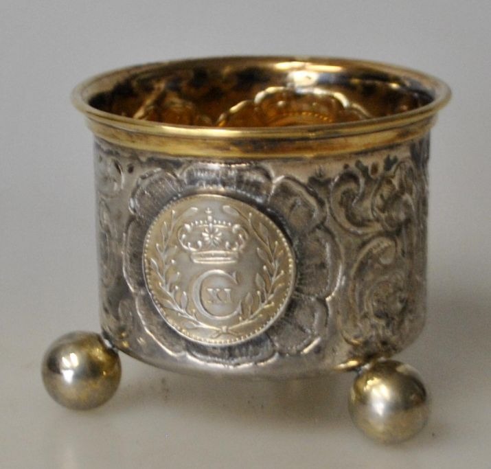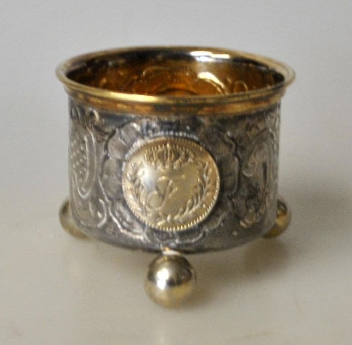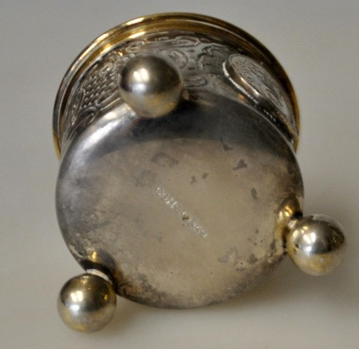 Svensk sølv bæger i barokform, 1951. På tre kuglefodder. Siden dekoreret med rocailler og to svenske enører fra henholdsvis 1694 og 1722. Indvendig lueforgyldt. Stemplet. H.: 4 cm. Dia.: 4,5 cm.