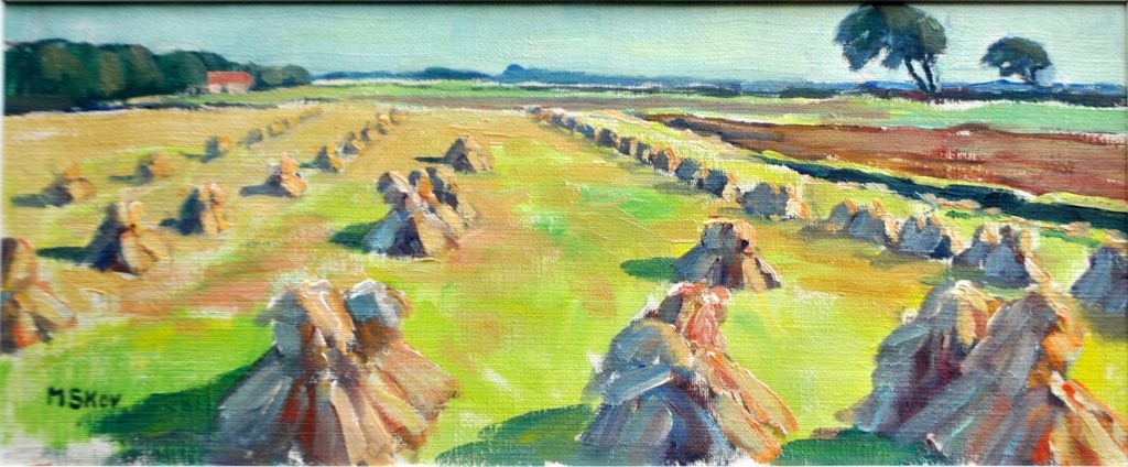 Skov, Marius (1885 - 1964) Danmark: Høstakke. Olie på lærred. Signeret. H: 30 cm. B: 71 cm.