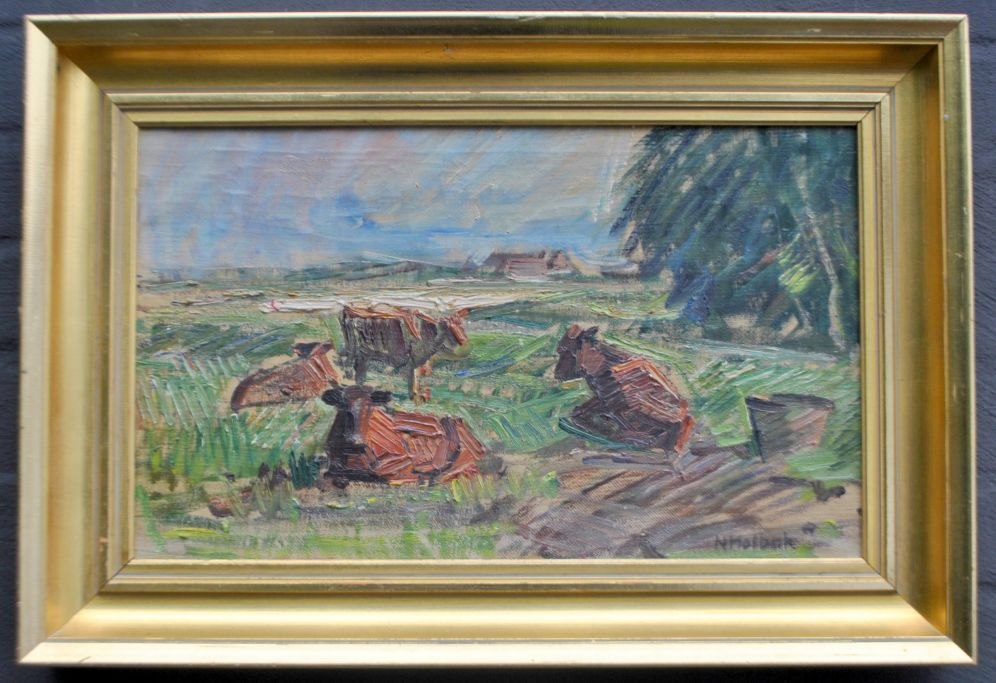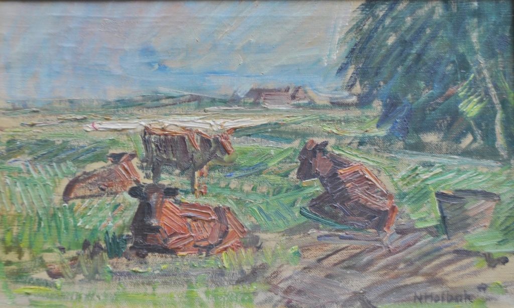 Holbak, Niels (1884 - 1954) Danmark: Køer på en mark, Vestjylland. Olie på lærred. Signeret. 27 x 43 cm.