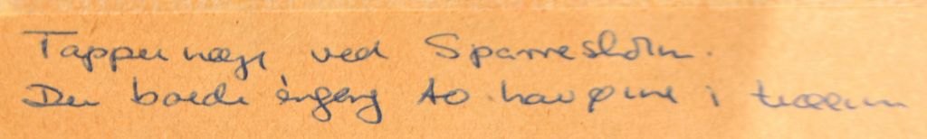 Verso teksten: Til Else - Qala'at al Bahrain 26 II 65 - og alle givernes egenhændige underskrifter: Kalle Bovin (pinxit), P. V. Glob, Geoffrey Bibby (medleder af ekspeditionerne till Golfen. Oprindelig engelsk arkæolog, bosat i Aarhus), Malene (dengang Malene Møller Jensen - nu Malene Ravn, arkitektstuderende og udgraver), Karen Kat (Karen Frifeldt, arkæolog og en af skspiditionernes garvede deltagere. Blev somme tider kaldt Karen Kat), Lilliana (gift med Bue, "husmoder" for ekspeditionen, Peter Crabb (arkæolog), Henning Nielsen (arkæolog - muligvis studerende) og Bue (gift med Lillian, fulde navn Svend Bue Madsen, amatørarkæolog fra Nordsjælland, del af ekspeditionen).