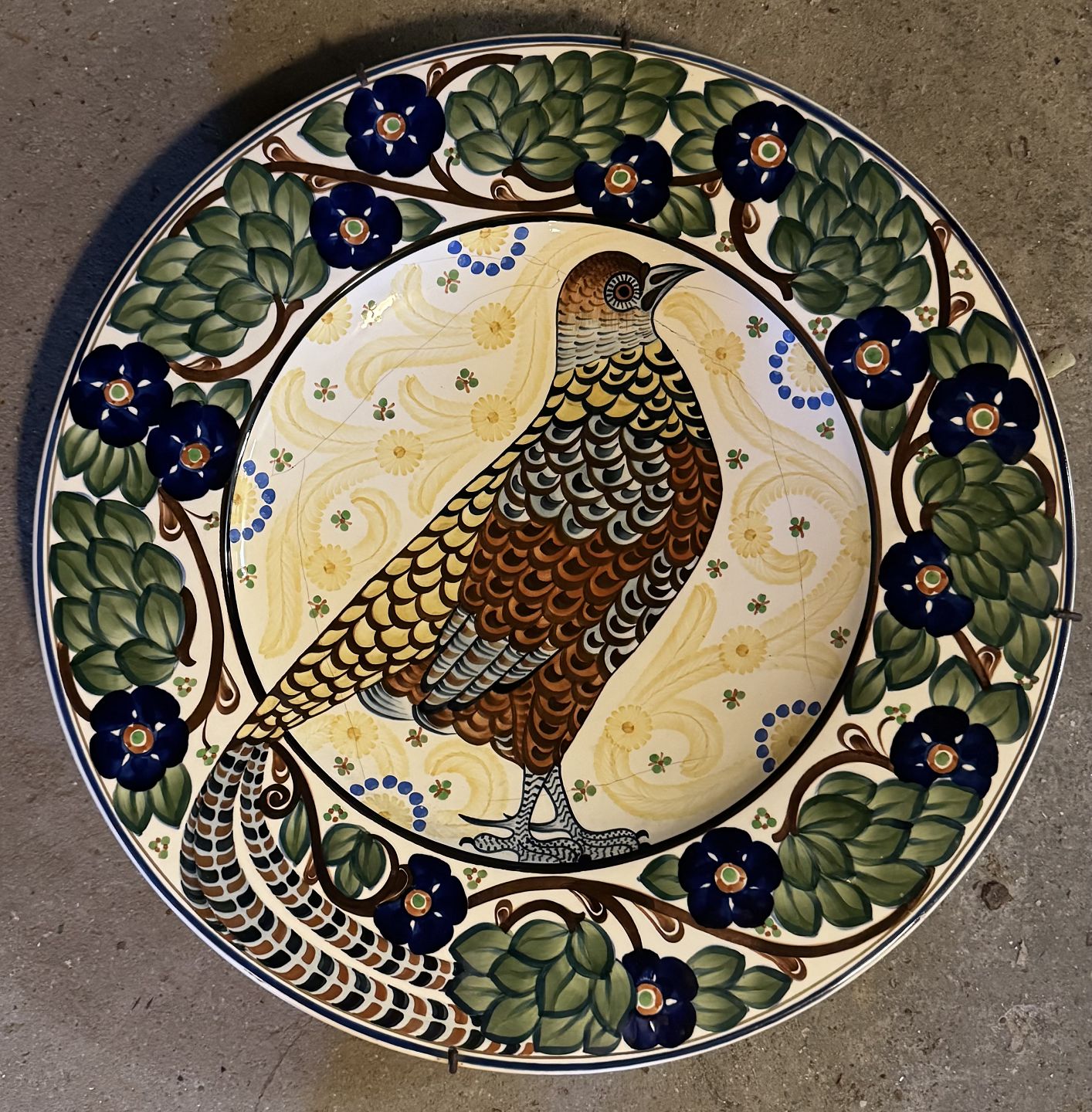Stort fajancefad fra Aluminia, dekoreret af Christian Joachim med et motiv af en guldfasan omgivet af blomster og blade. Fabriksmærket på bagsiden. Som det fremgår af fotos er der flere revner efter skade på fadet. Mål: Ø. 45,5 cm FORSENDELSE IKKE MULIG - SKAL AFHENTES PÅ FREDERIKSBERG