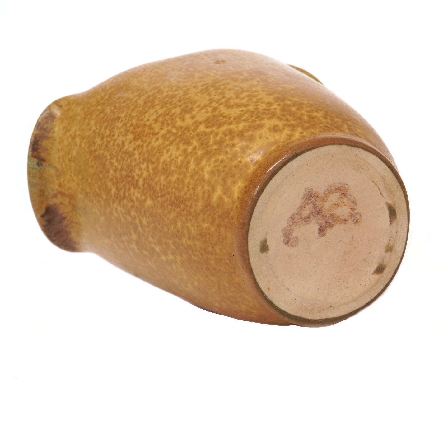 Arne Bang stentøjsvase i stentøj med spættet okkerfarvet glasur signeret AB. H: 11cm