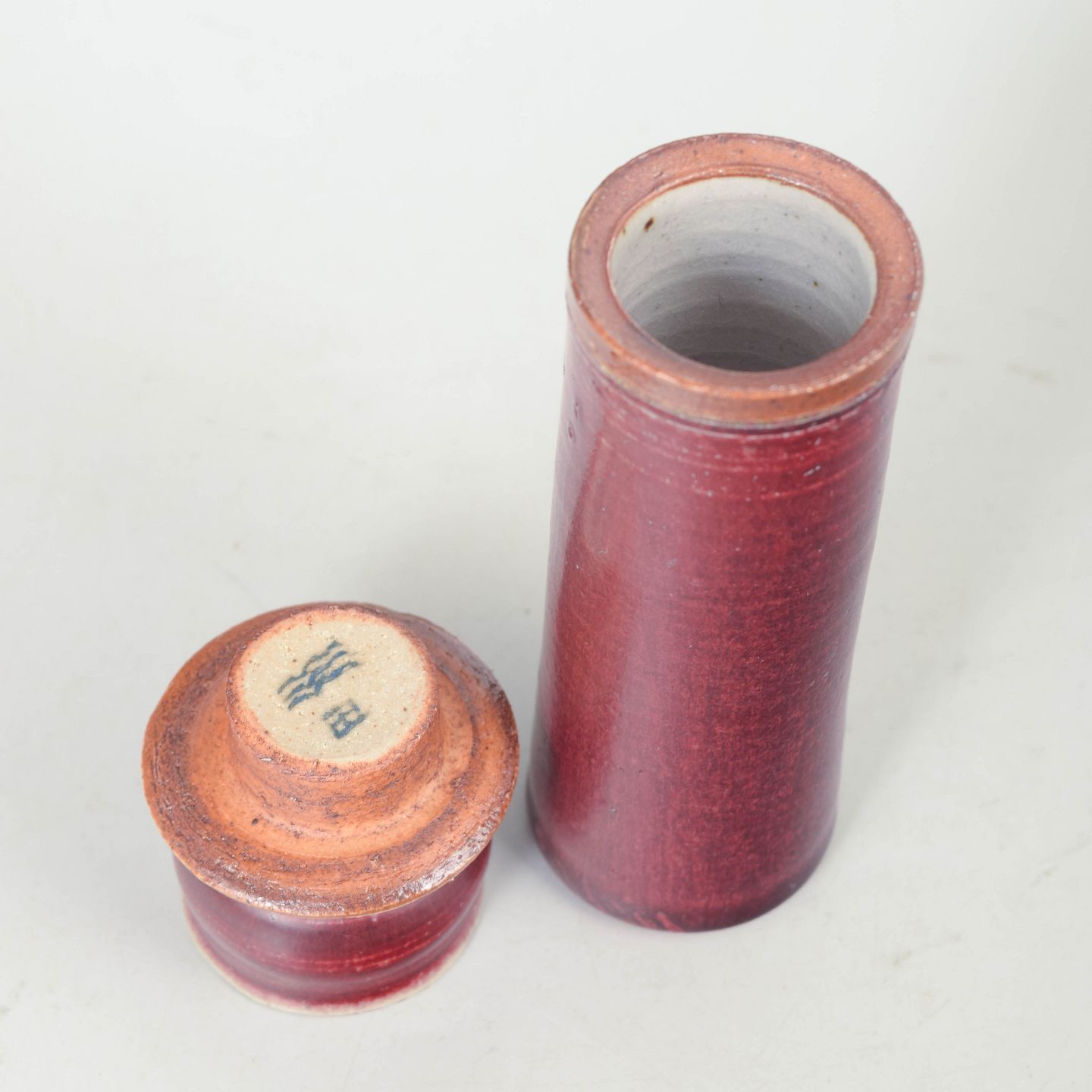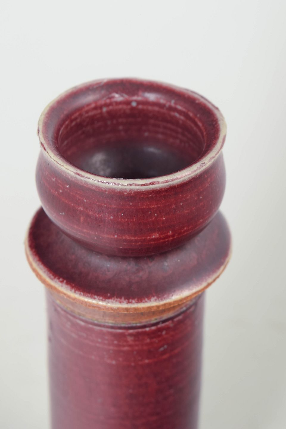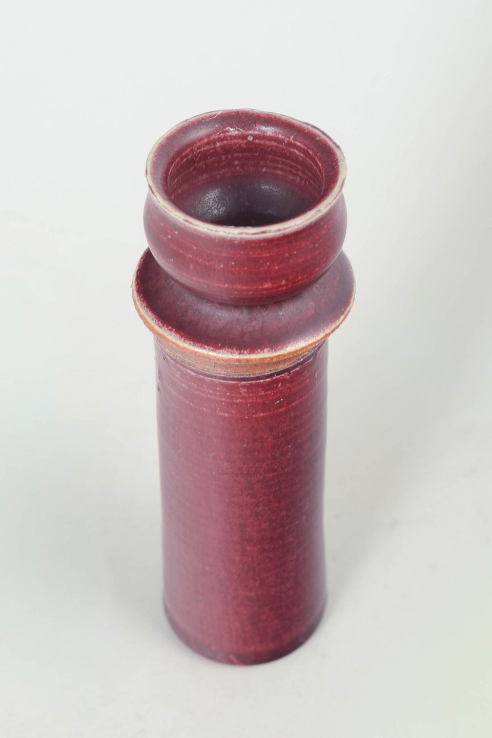 Slank og cylindrisk lysestage udført i keramik med dyb rød okseblods glasur og klassisk form. Fremstår som et unikt stykke med elegant proportionering og karakteristisk glasurspil. Første sortering.