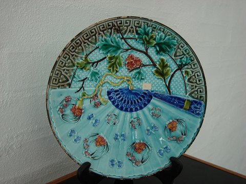 Fajancetallerken med kinesisk vifte og floral dekoration.