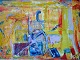 Farvelitografi i klare farver, abstrakt motiv med figurer og ...