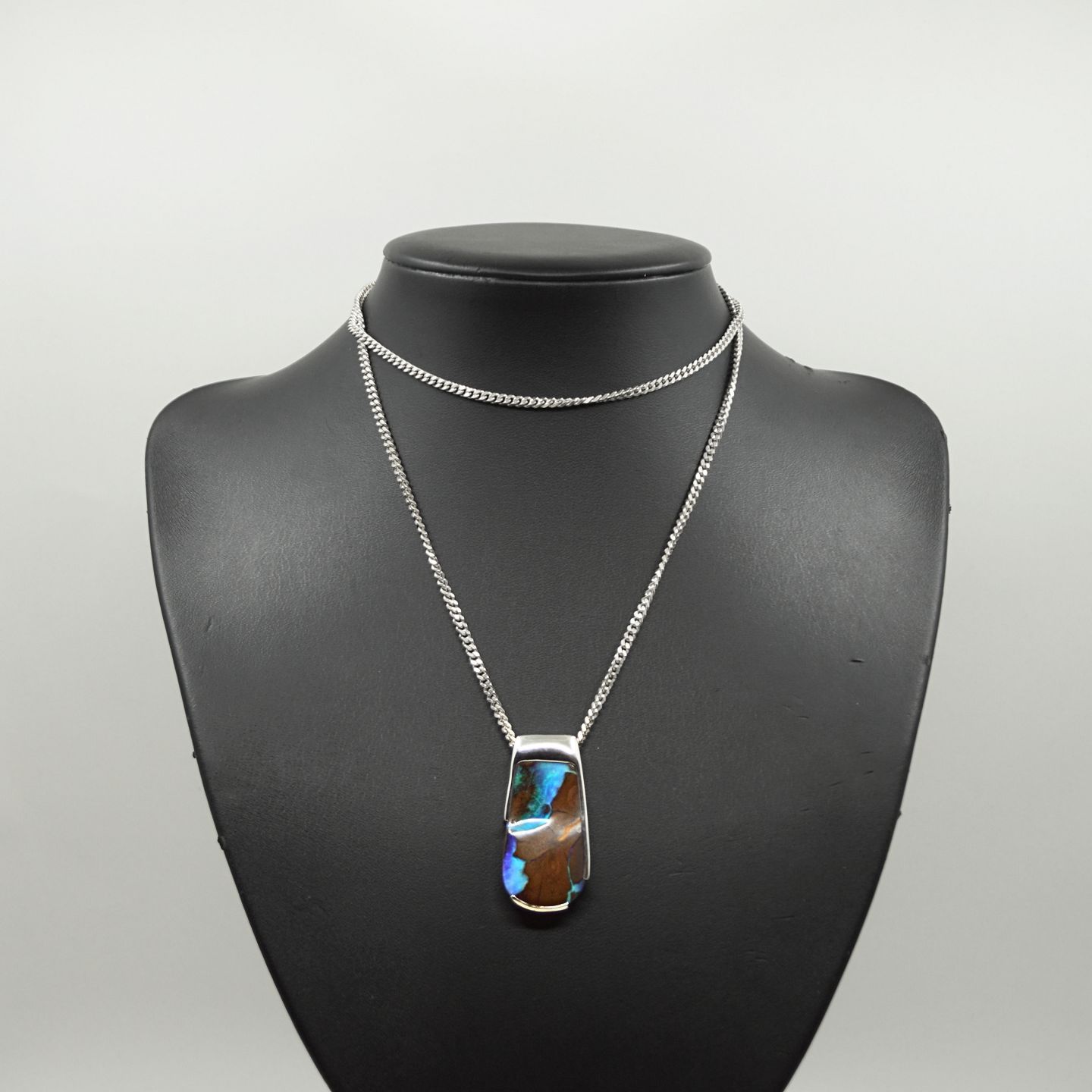Large silver pendant with opal in blue and brown. Including long silver chain.