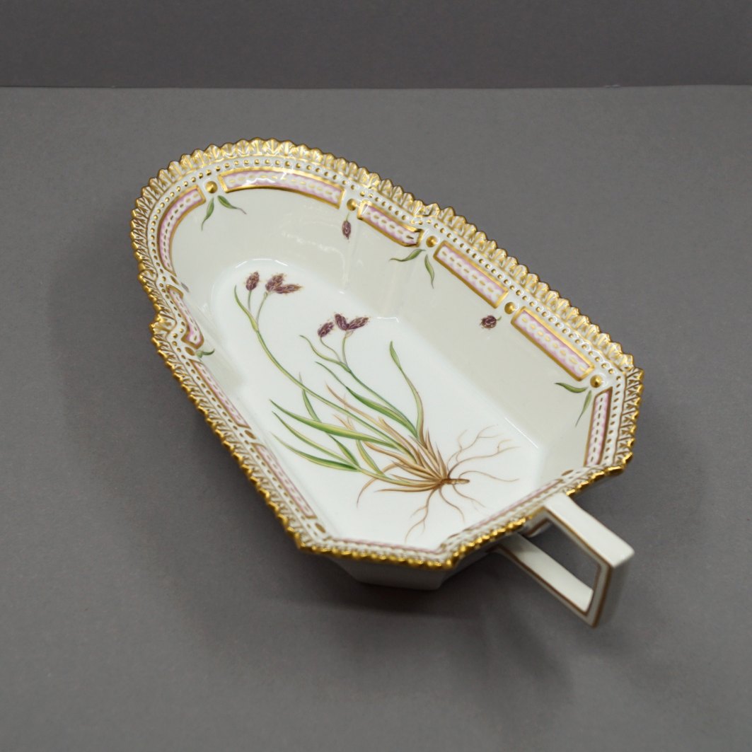 Royal Copenhagen, Flora Danica porcelain; Dish/bowl #3544. Decoration: Carex bicolor All. Decorated in colours and gold with flowers. L. 21 cm. W. 11,8 cm.