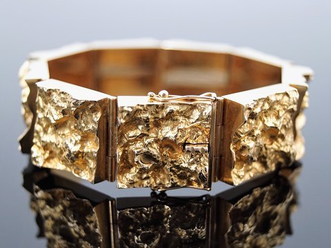 Kraftigt håndsmedet armbånd af 14 kt. guld sammensat af 9 led.