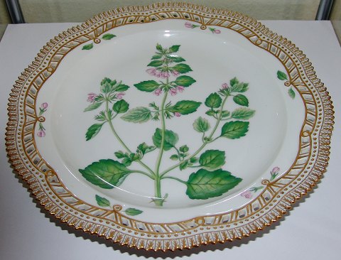 Kongelig Porcelæn Flora Danica Gennembrudt Fad eller Buffet Tallerken 20/3574 nyt nummer 381. Blomsten er: "Ballota ruderalis Sw.". Måler 29cm, første sortering og i perfekt stand. Royal Copenhagen