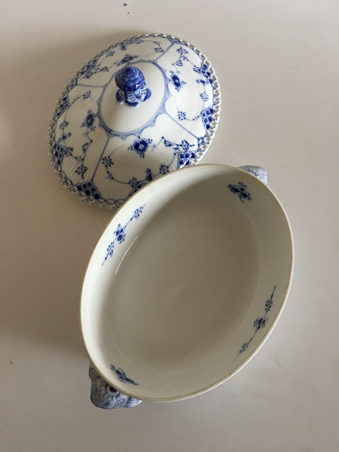 Royal Copenhagen Blue Fluted Full Lace Oval Lidded Dish No 1129. Measures 25.5 cm x 20 cm (10 3/64" x 7 7/8").