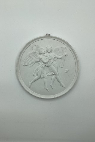 Bing & Grøndahl Biscuit Platte Poesiens og harmoniens Genier No 106. Kopi fra 1866 efter Thorvaldsens original fra Rom 1843. Har mindre skår på kanten, øverst midt på (se foto) Måler 14,5cm