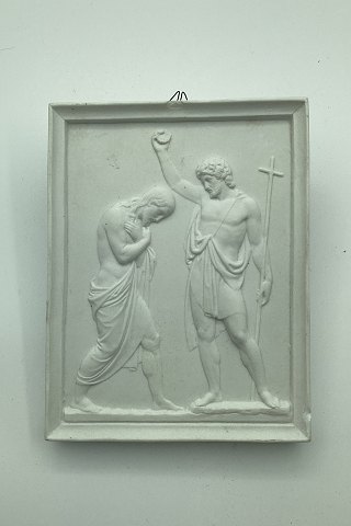 Royal Copenhagen Biscuit Platte Kristi Dåb No 113. Kopi af O.H.B. Olrik fra 1848 after Thorvaldsen original fra Rom 1805-07. Måler 16cm x 12cm. Har nogle skår. Midt på øverst. Nederste højre hjørne samt på bagsiden.