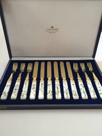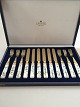 Knifes measures 20,3cm and forks 18,7cm. The handles is made of porcelain and the tool part is gilded silver from Michelsen silversmithy.