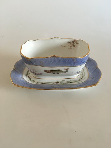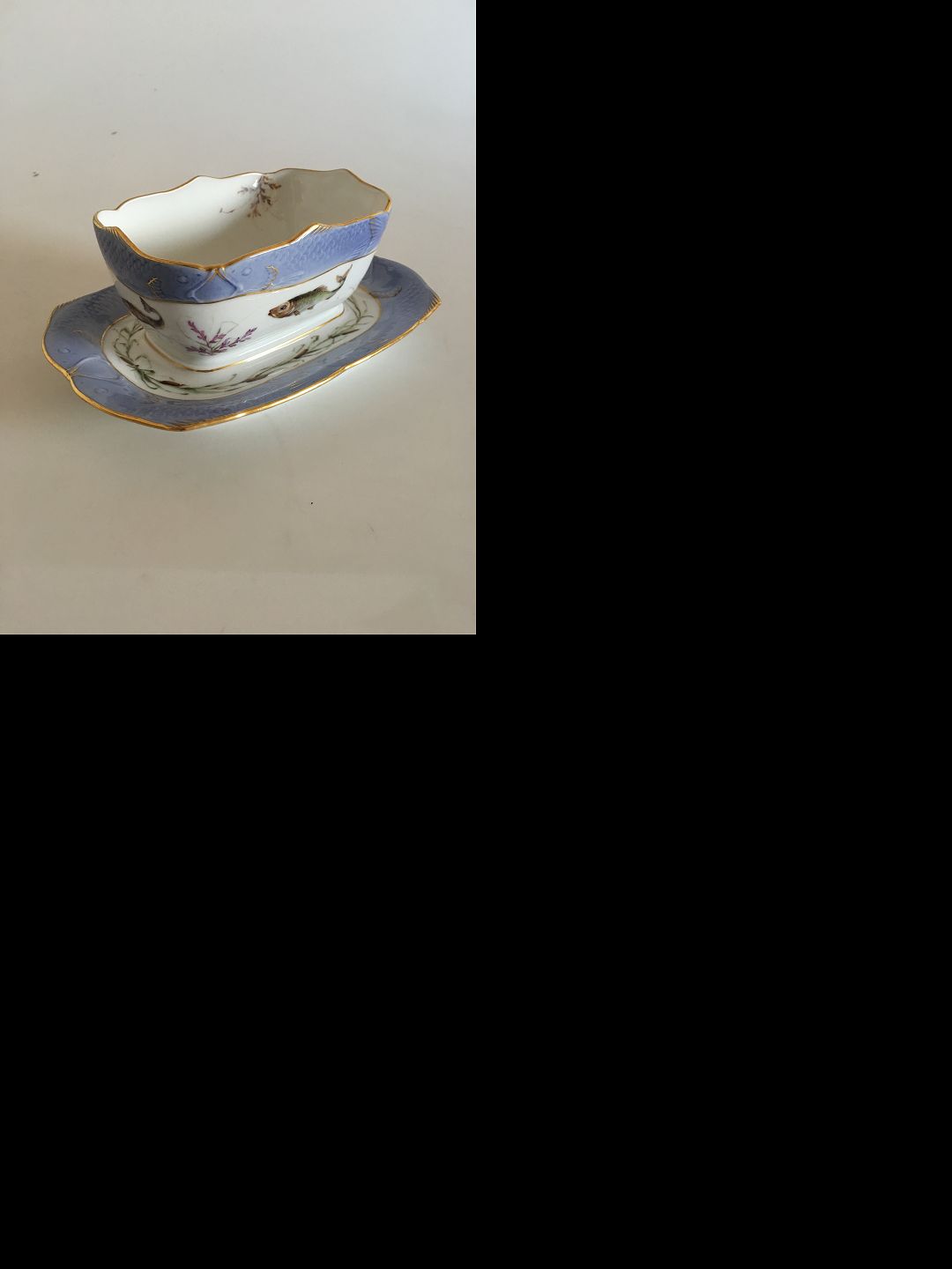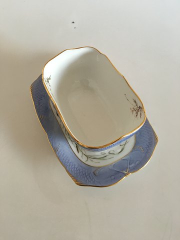 Royal Copenhagen Blå Fiskestel med Guld Sauce Skål. 10 cm høj. Selve Saucebeholderen måler 14.5 x 9.5 cm