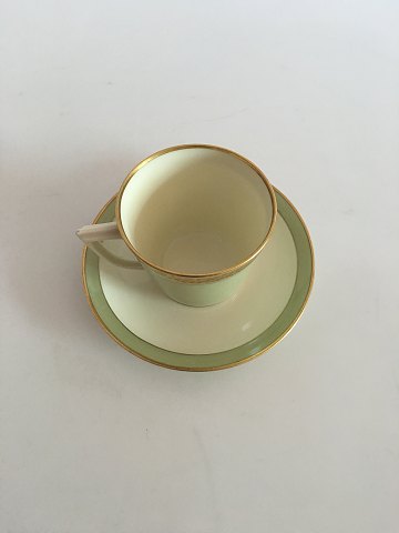 Royal Copenhagen Dagmar Kaffekop og Underkop No. 9481. 17 cl. (5 3/4 oz.) Pistaciegrøn og cremefarvet stel med guldkant designet af Thorkild Olsen i 1930'erne