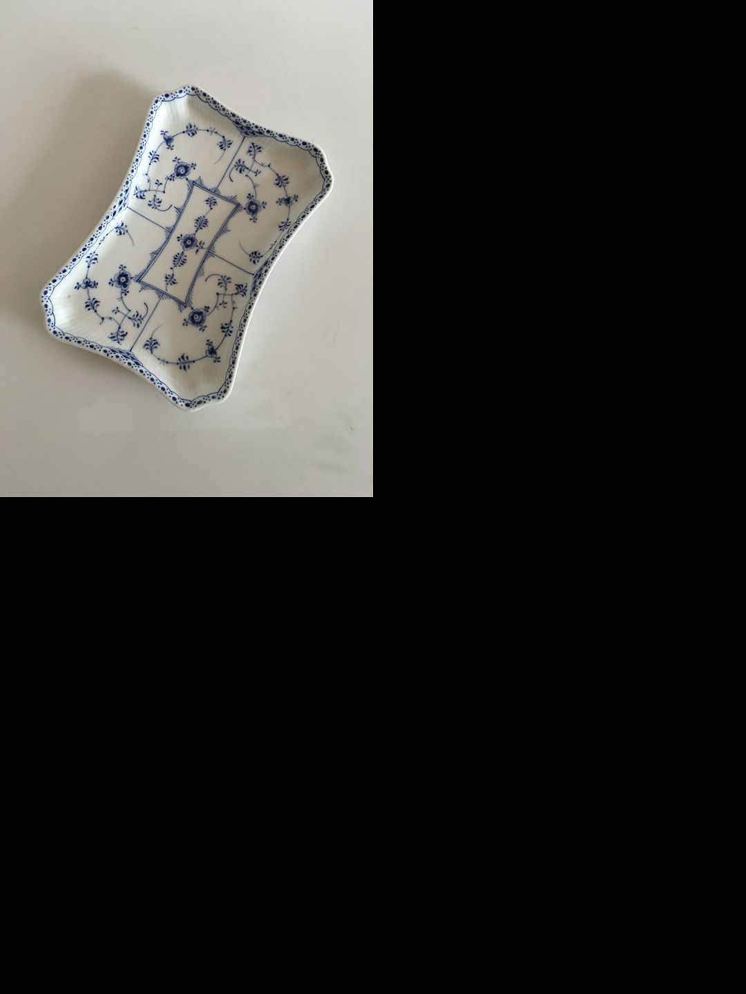 Royal Copenhagen Musselmalet Halvblonde Aflang Bakke No 716. Måler 24,5 cm x 17 cm. 1. Sortering