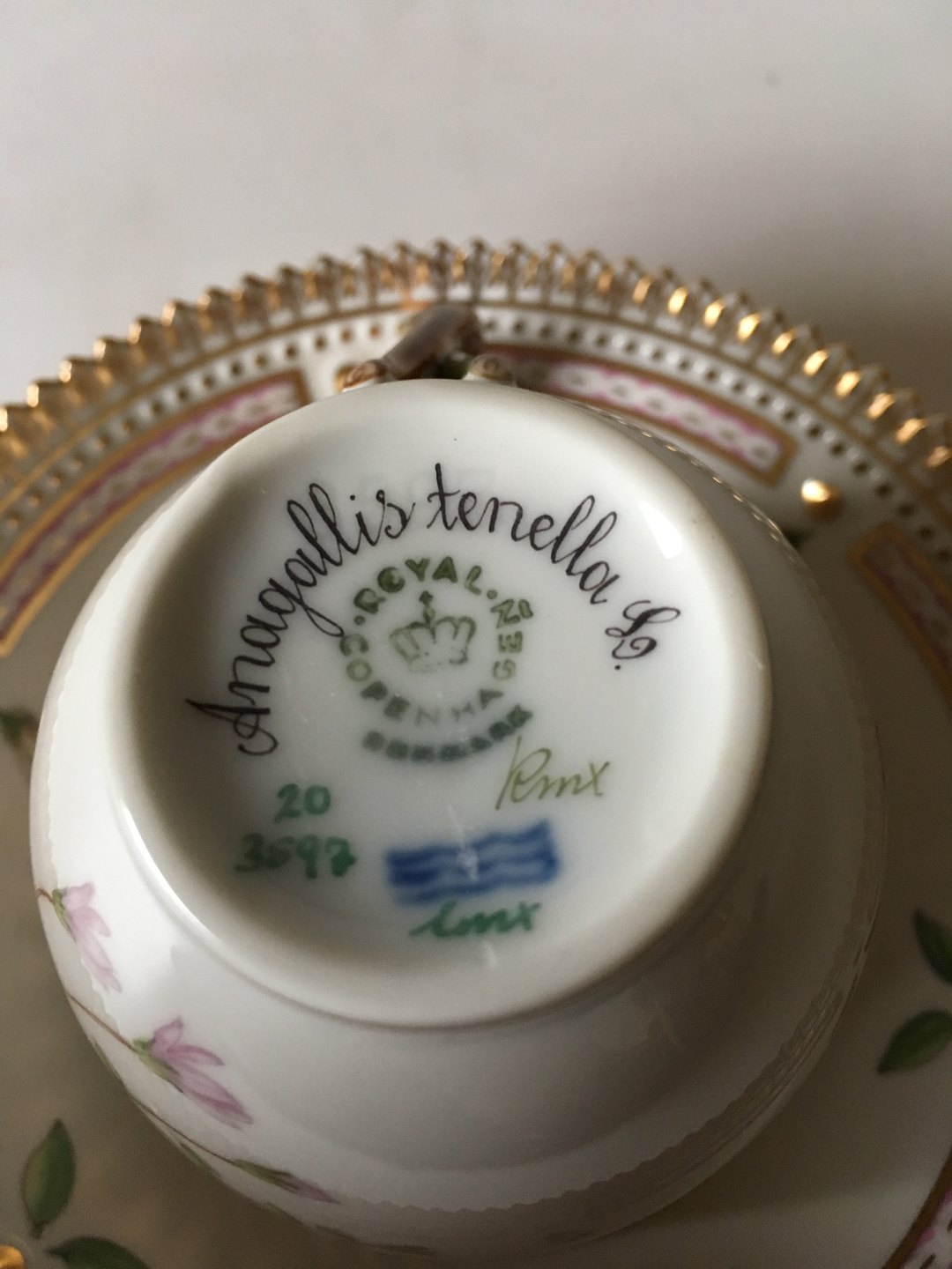Royal Copenhagen Flora Danica Coffee Cup and Saucer No 20/3597. Latin Name: Anagallis Tenella. 2nd Quality. In perfect whole condition. 7 x 7 cm (2 3/4")