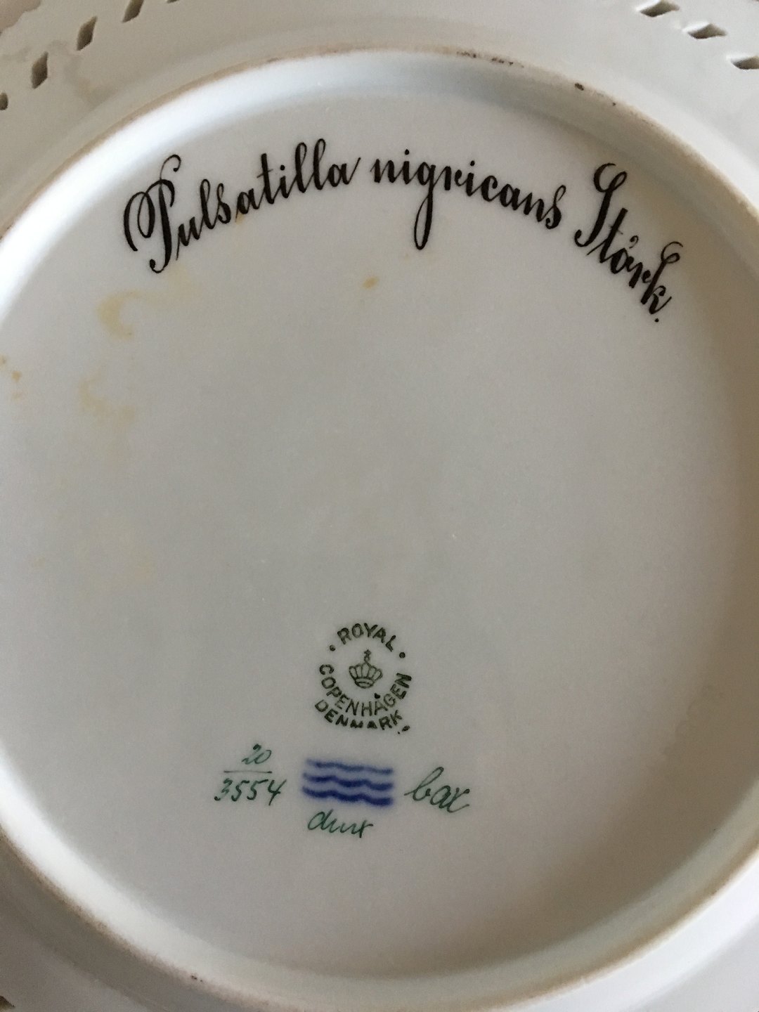 Royal Copenhagen Flora Danica Frokosttallerken No 20/3554. Latinsk Navn: Pulsatilla Nigricans. 23 cm. 1 sort. I perfekt stand.