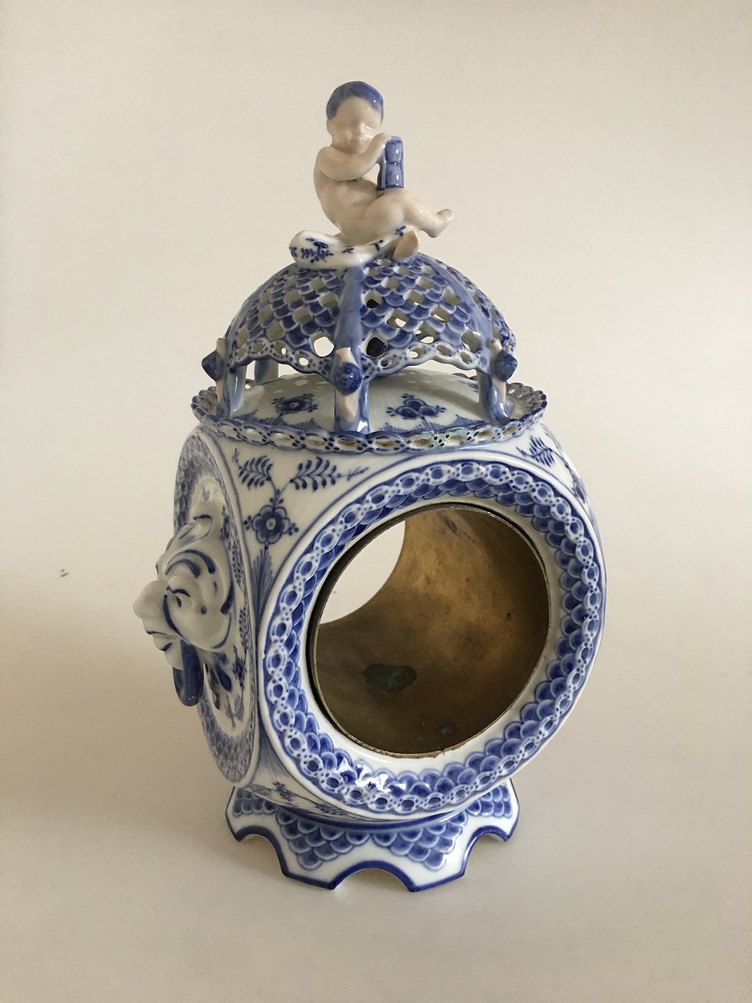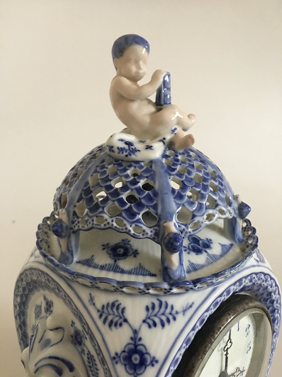 “Blue Fluted Full Lace” porcelain clock decorated in underglaze blue. Royal Copenhagen 1017, end of 19th century. H. 28 cm. The clock has larger repairment at the bottom foot piece, and a minor in comparison on the top lace border. Look at pictures