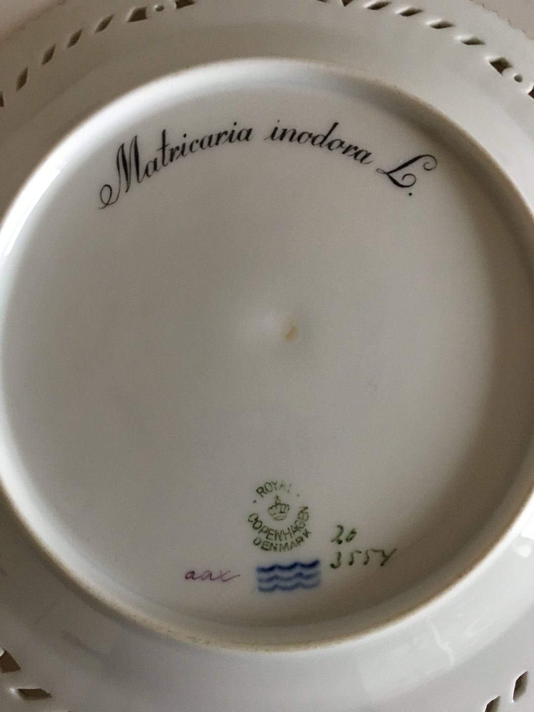 Royal Copenhagen Flora Danica Gennembrudt Frokost Tallerken No 20/3554. 23 cm Ø. Latinsk Navn: Matricaria Inodora (Lugtløs Kamille). Med gammelt stempel fra 1923-1934.