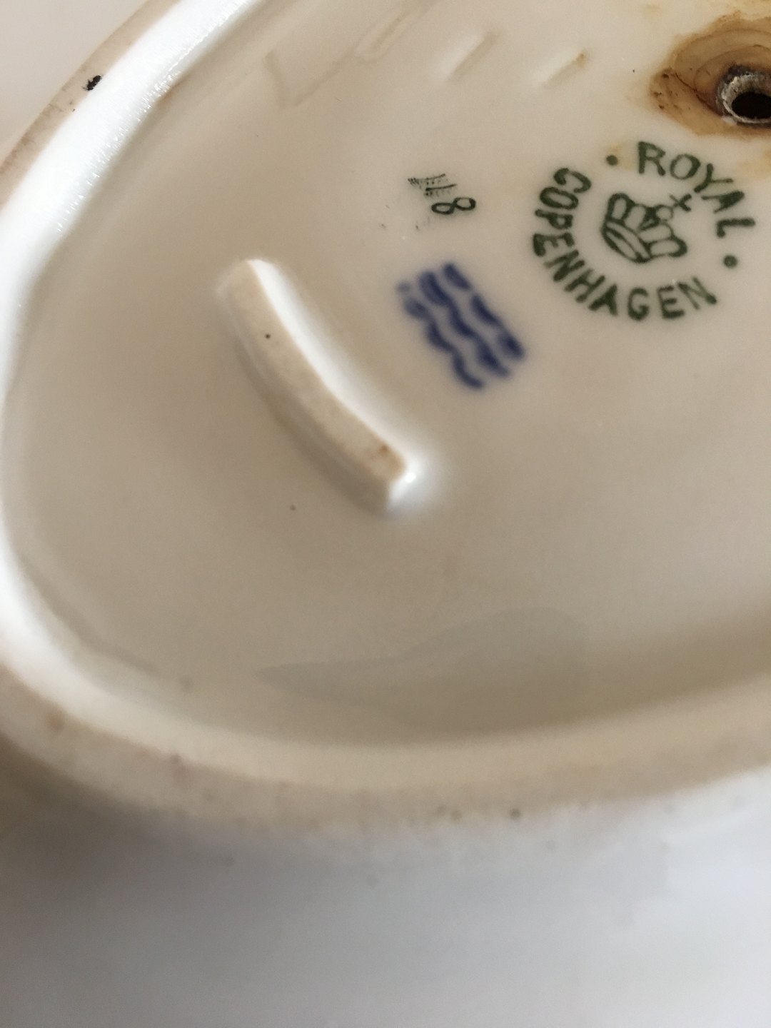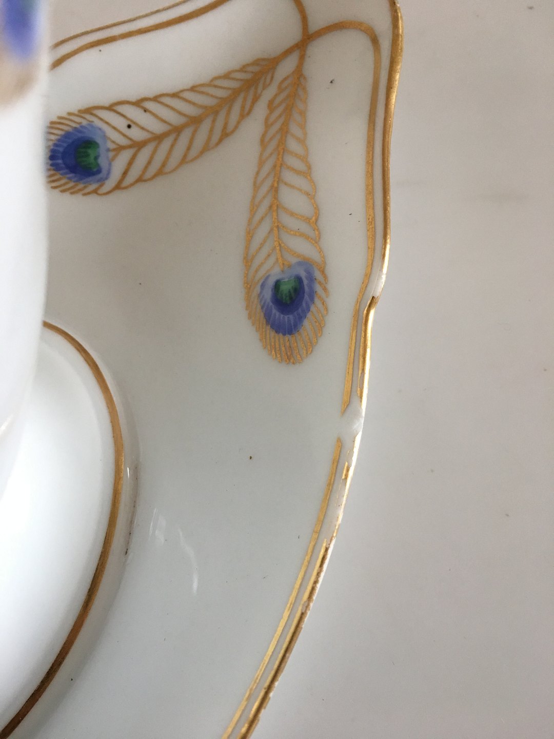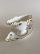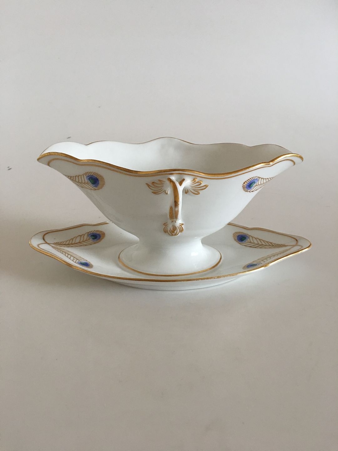 Royal Copenhagen Stel No 118 Sauceskål med Hanke Påfugl med Guldkant. 10 cm H. 21 cm L. Skålen har et skår nede på underdelen (se billede) Ellers i pæn stand, med kun lidt slid her og der på guldet. Antikt, Sjældent Spisestel fra Royal Copenhagen