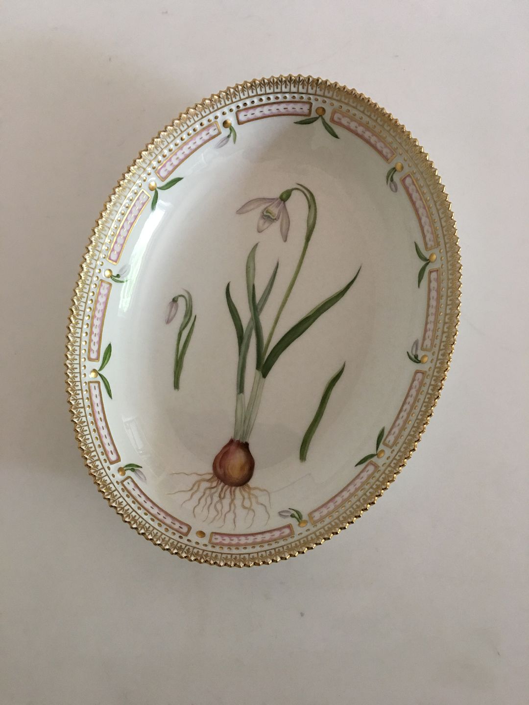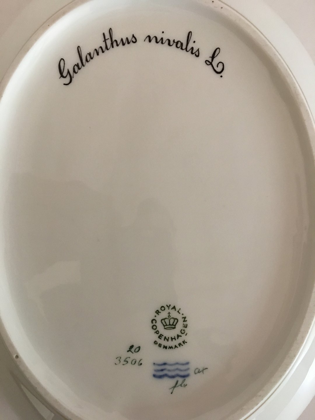 Royal Copenhagen Flora Danica Oval Skål no. 3506. 5 cm H. 24 x 18.5 cm. Latinsk Navn: Galanthus Nivalis (Vintergæk). 1. Sortering, I perfekt stand.
