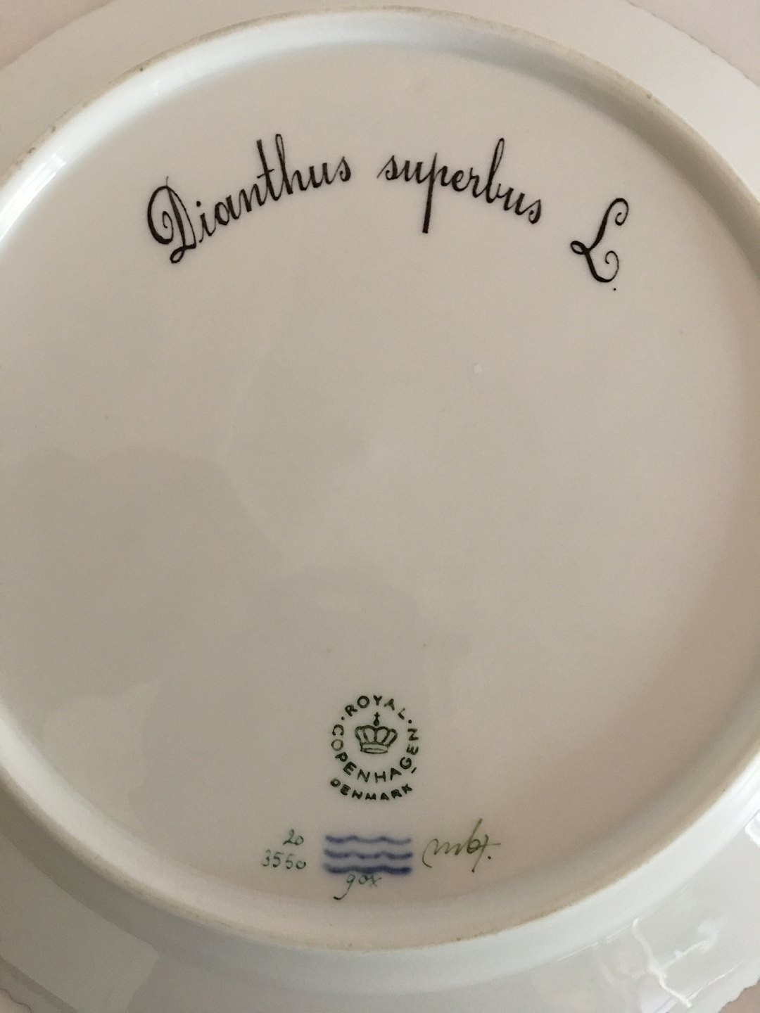 Royal Copenhagen Flora Danica Luncheon Plate no. 3550. 22 cm dia (8 21/32"). Latin Name: Dianthus Superbus. 1st Quality, In perfect condition.