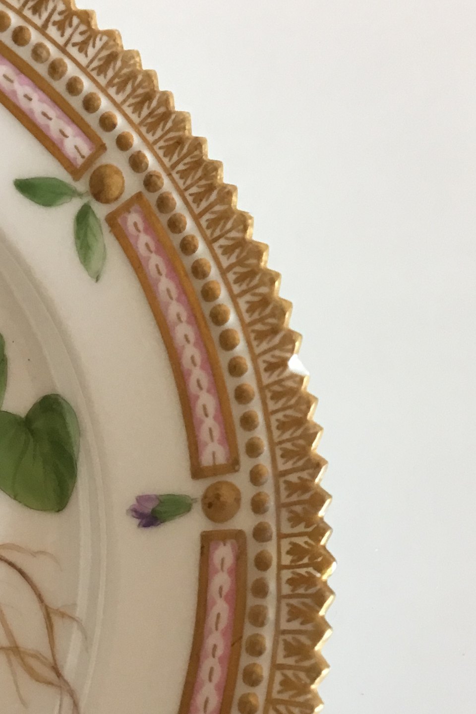 Royal Copenhagen Flora Danica Frokosttallerken No 20/3550. Måler 22 cm. 1. Sortering. Latinsk navn: "Viola odorata L.". Afslag på kant