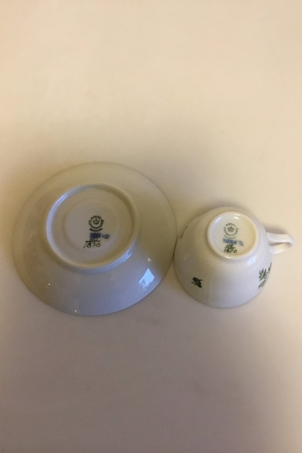 Royal Copenhagen Green Flower Curved Coffee Cup and Saucer No 1870. Measures Cup: 8 cm / 3 5/32 in. dia. Saucer: 14 cm / 5 33/64 in. dia.