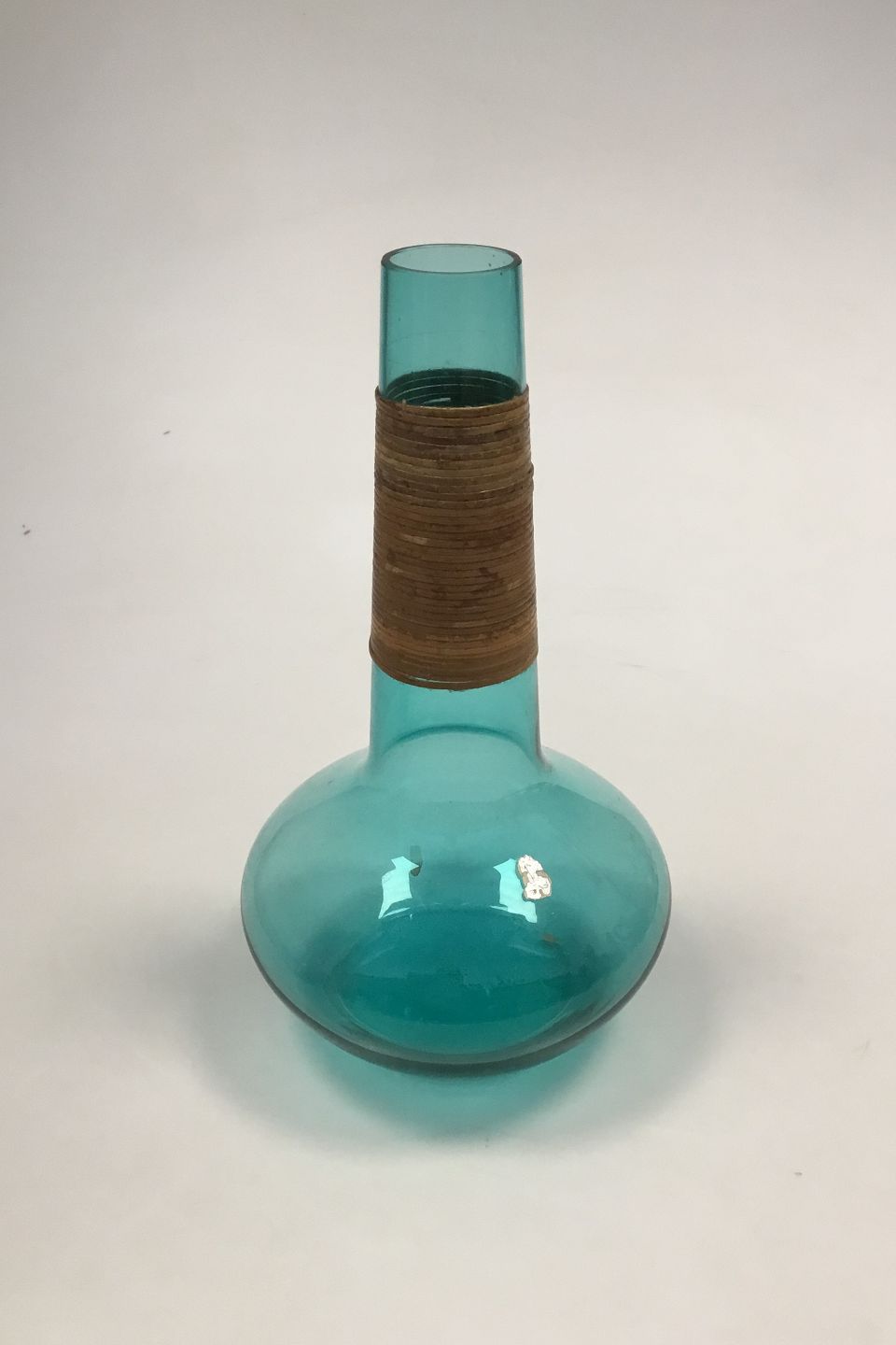 Kastrup Glassworks Opaline shape Green Carafe with wrapped bamboo without Cork. Jacob E. Bang 1957. Measures 26 cm / 10 15/64 in.