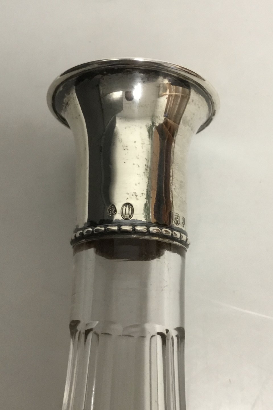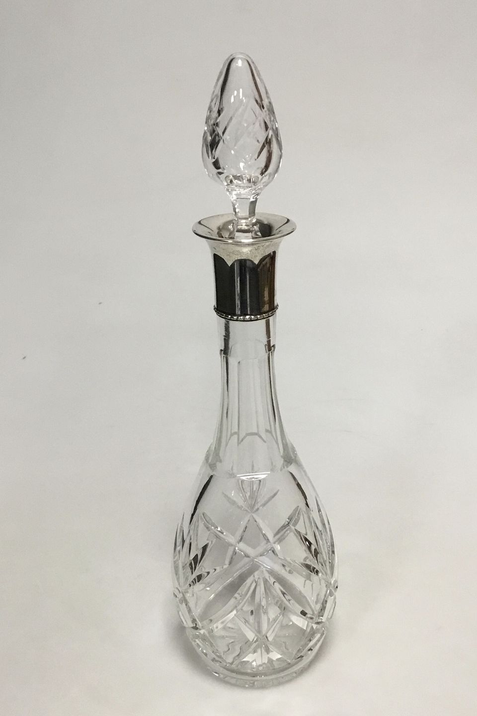 Karaffel i facetslebet krystal glas med sølv krave. Prop luftfyldt og facetslebet. H m. prop: 35 cm