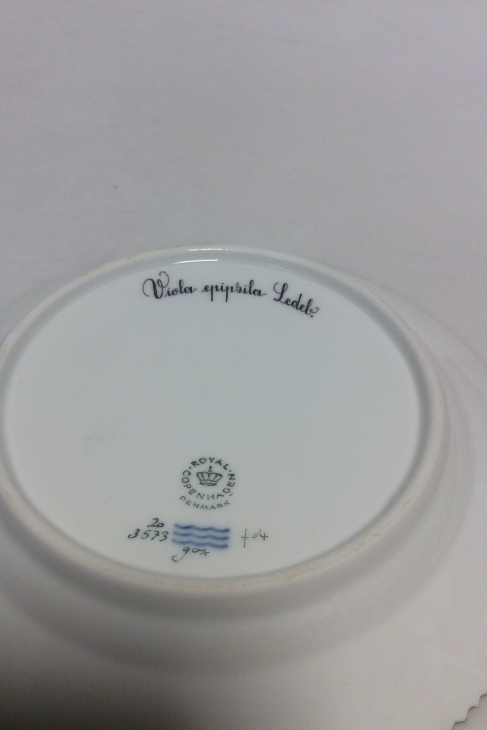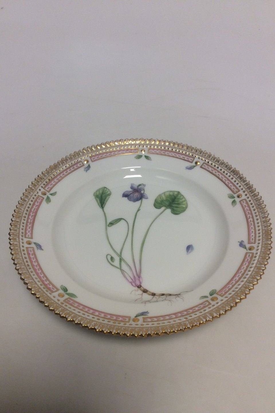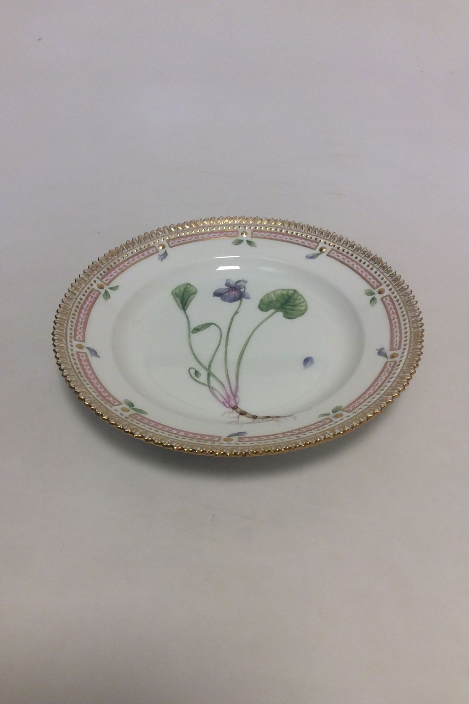 Royal Copenhagen Flora Danica Salad Plate No 20/3573. Latin name: Viola epipsila Ledeb Measures 19.2 cm / 7 9/16 in. Has a Chip, see pictures