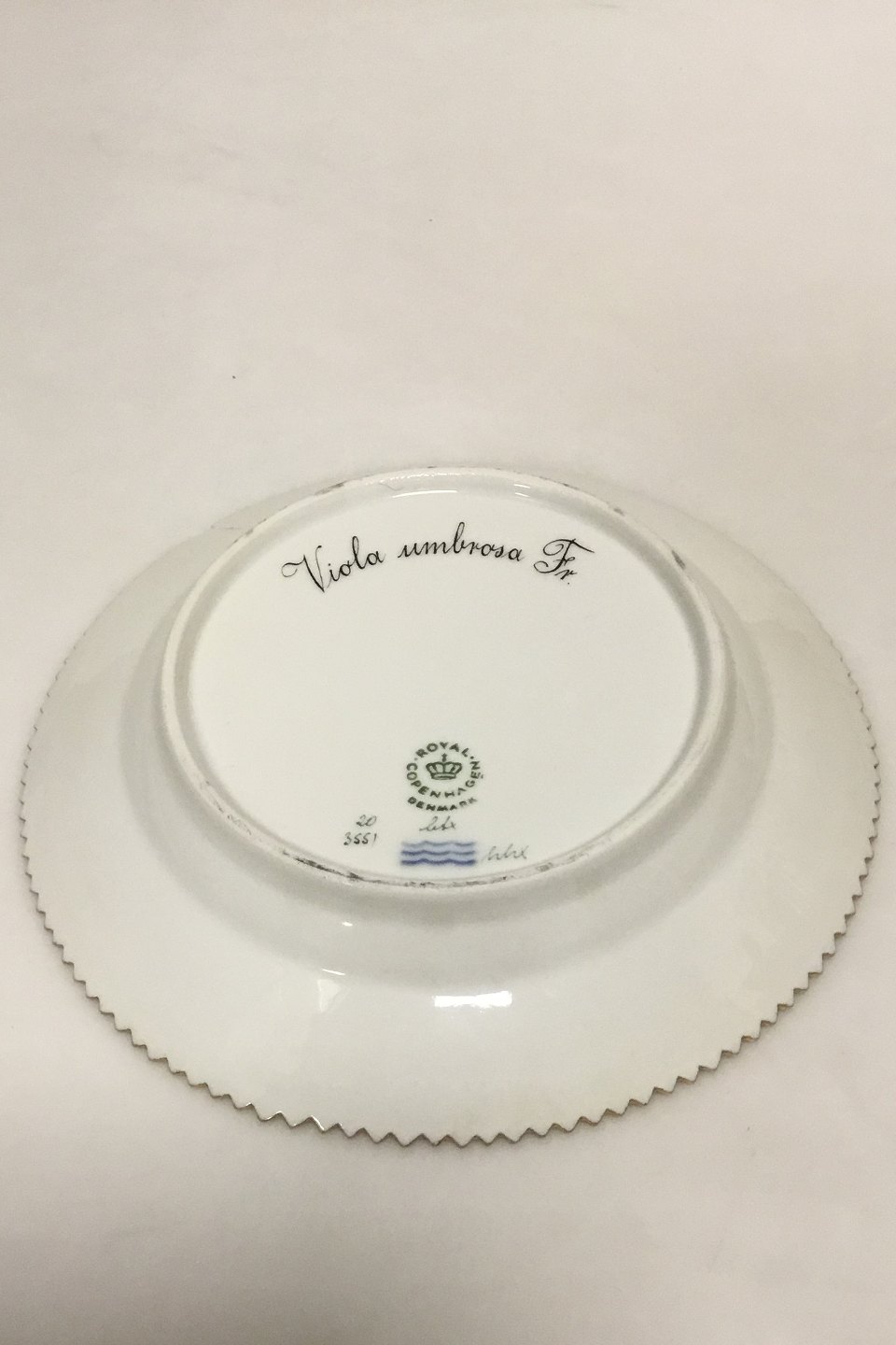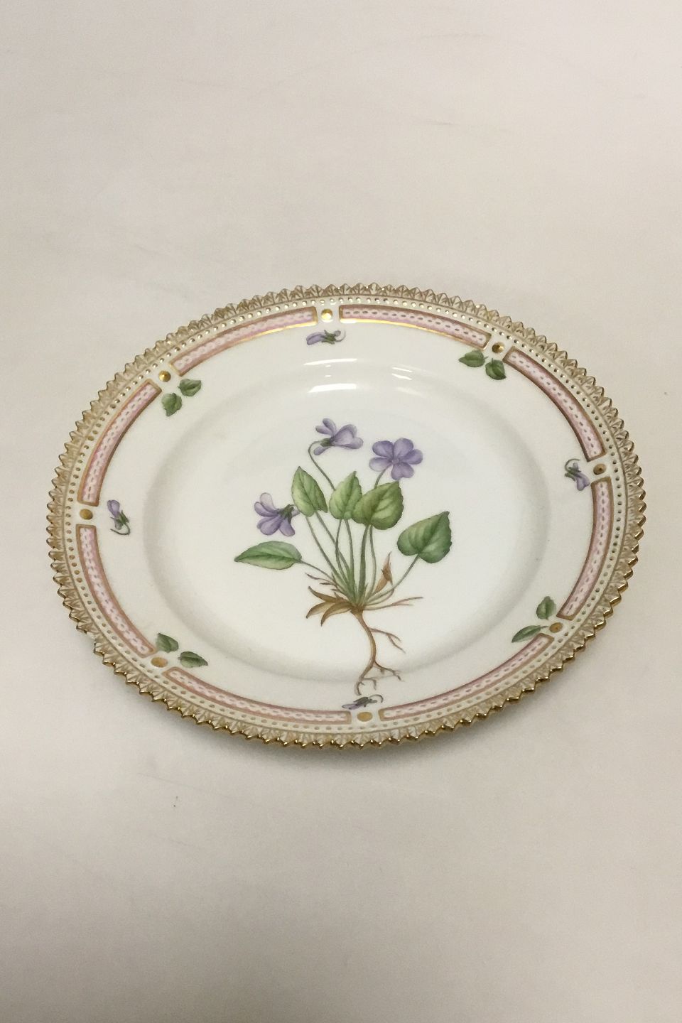 Royal Copenhagen Flora Danica Dessert Plate No 20/3551 Latin Name: Viola umbrosa Fr.. Measures 17 cm (6 11/16") ( With Chip/hairline)