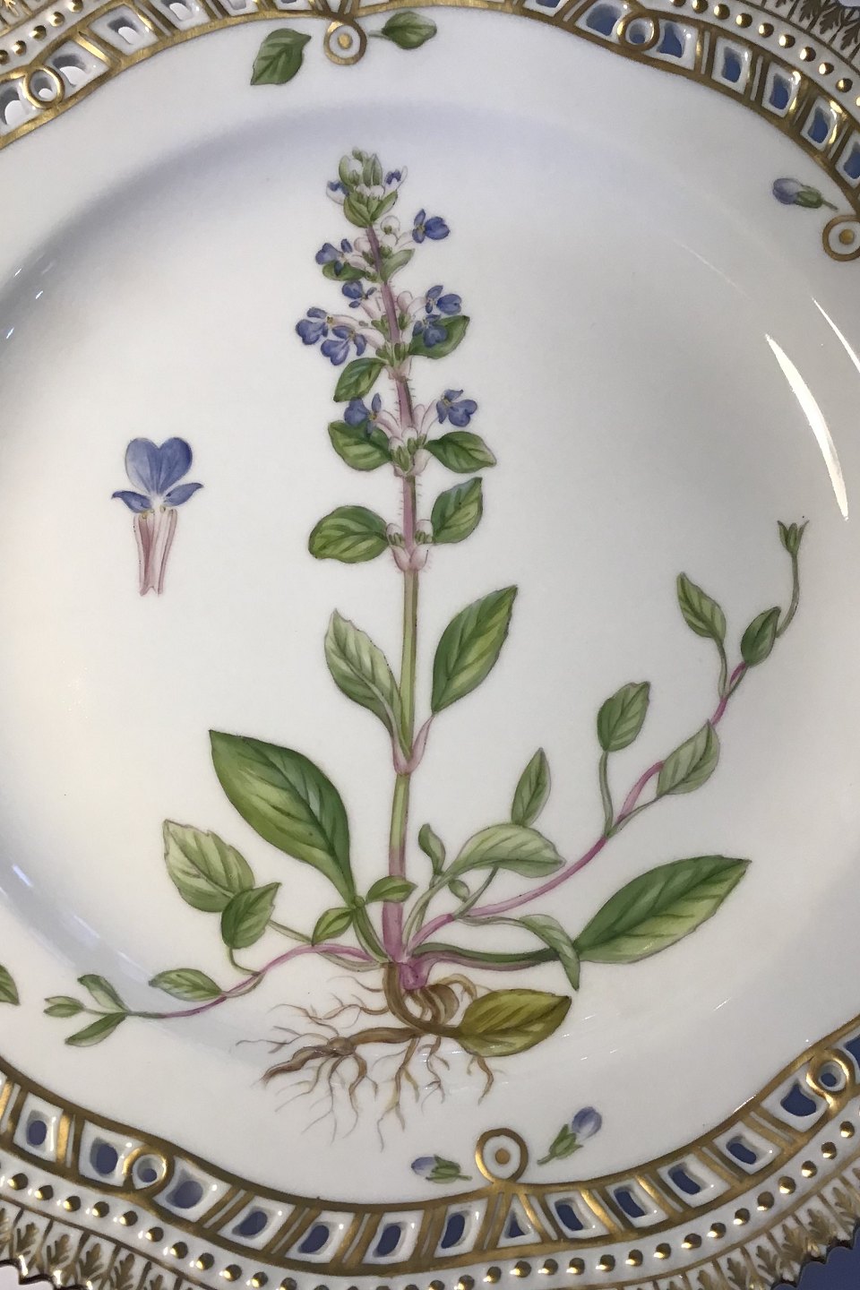 Royal Copenhagen Flora Danica tallerken med gennembrudt kant No 20/3553. Latinsk navn: Ajuga reptans L Måler 25,5 cm(10 3/64 in.)