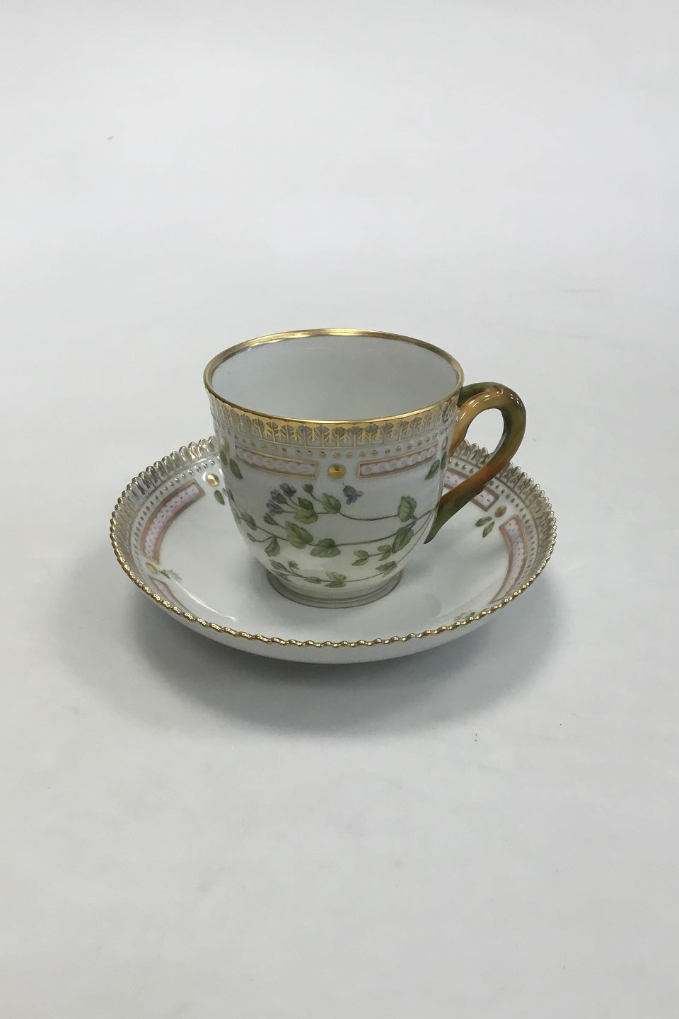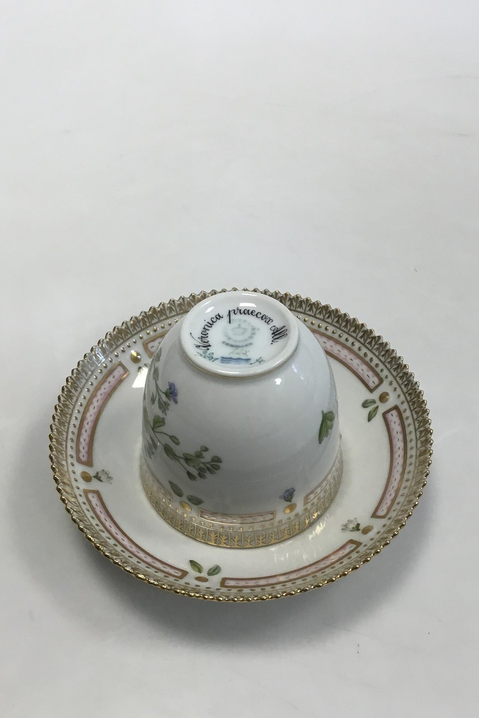 Royal Copenhagen Flora Danica Kaffekop og Underkop No 20/3597. Latinsk Navn: Veronica praecox All. Måler Kop: 7 cm x 7,5 cm dia. Underkop: 13,8 cm