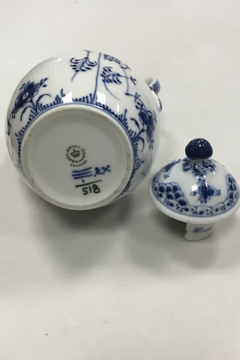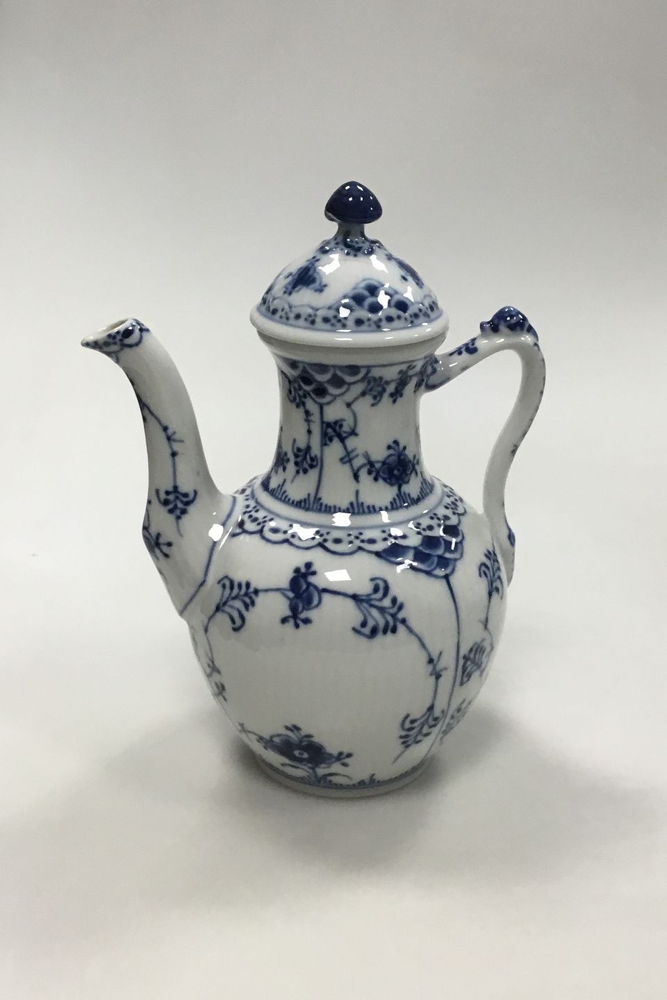 Royal Copenhagen Blue Fluted Half Lace Coppee Pot No 518. 1st Quality. Measures 22 cm / 8 21/32 in. Lid is broken