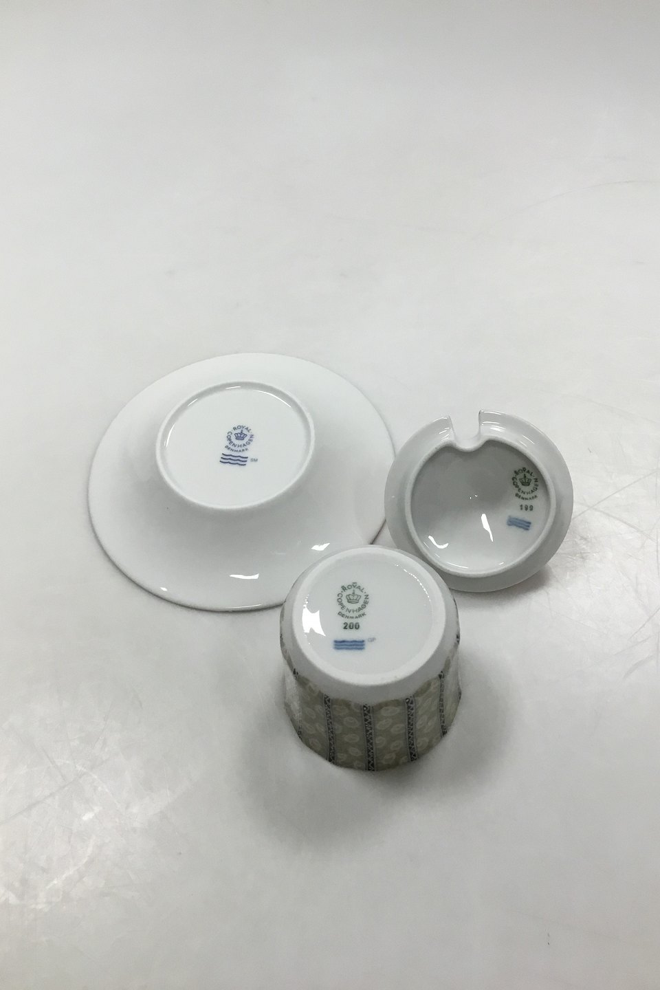 Royal Copenhagen Fairytale Mustard Jar No 200 with Lid No 199, and Saucer No 198 in Gray / Terracotta. Jar with lid measures 6.8 x 9 cm (2 43/64 x 3 35/64 in). Saucer mesures 12.5 cm (4 59/64 in).