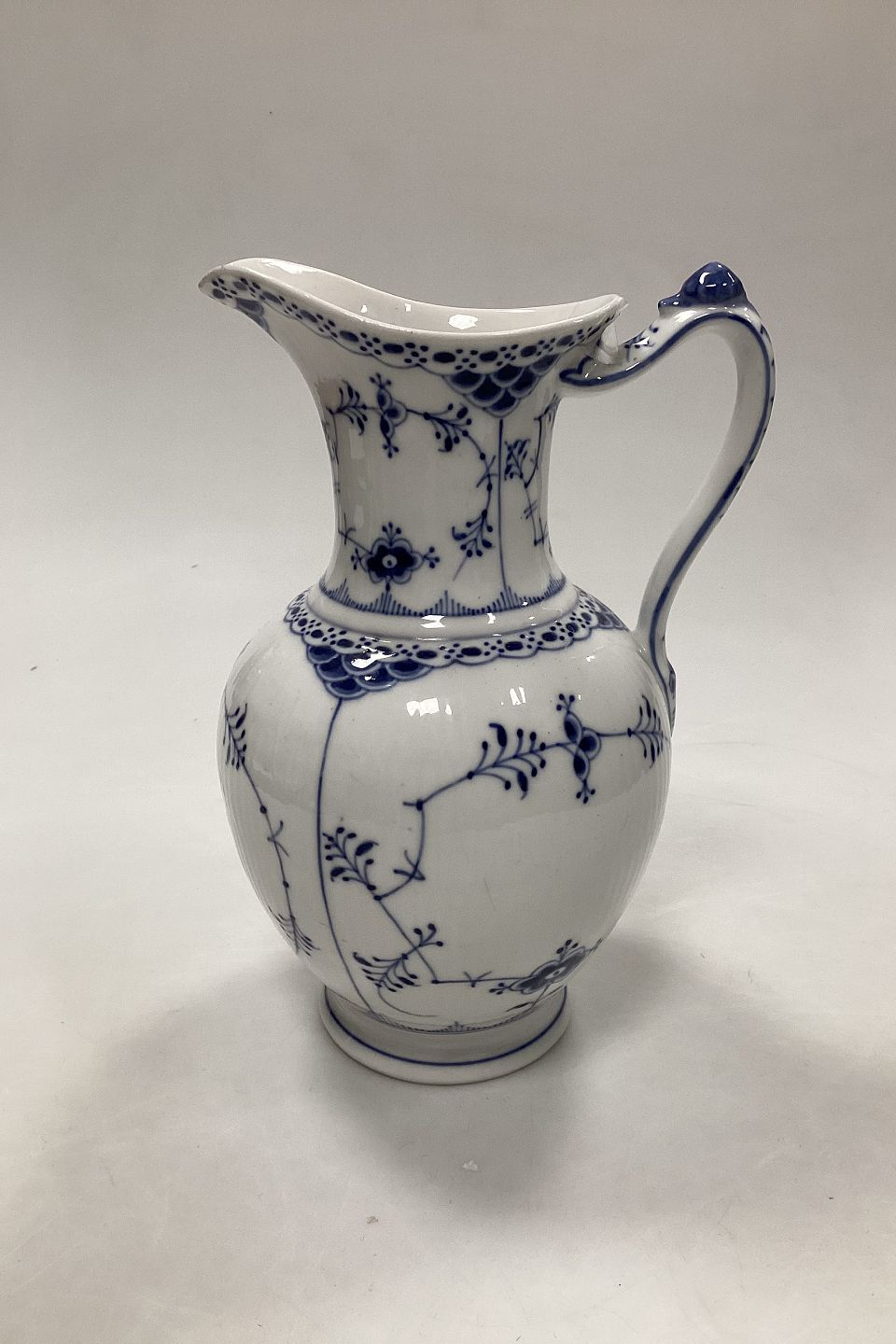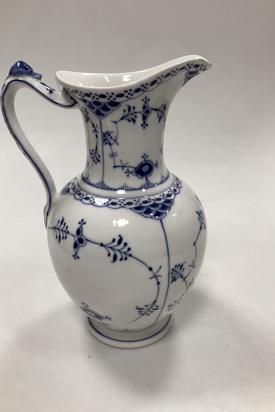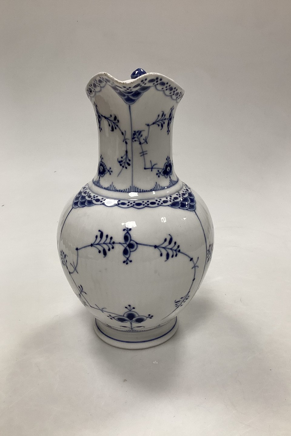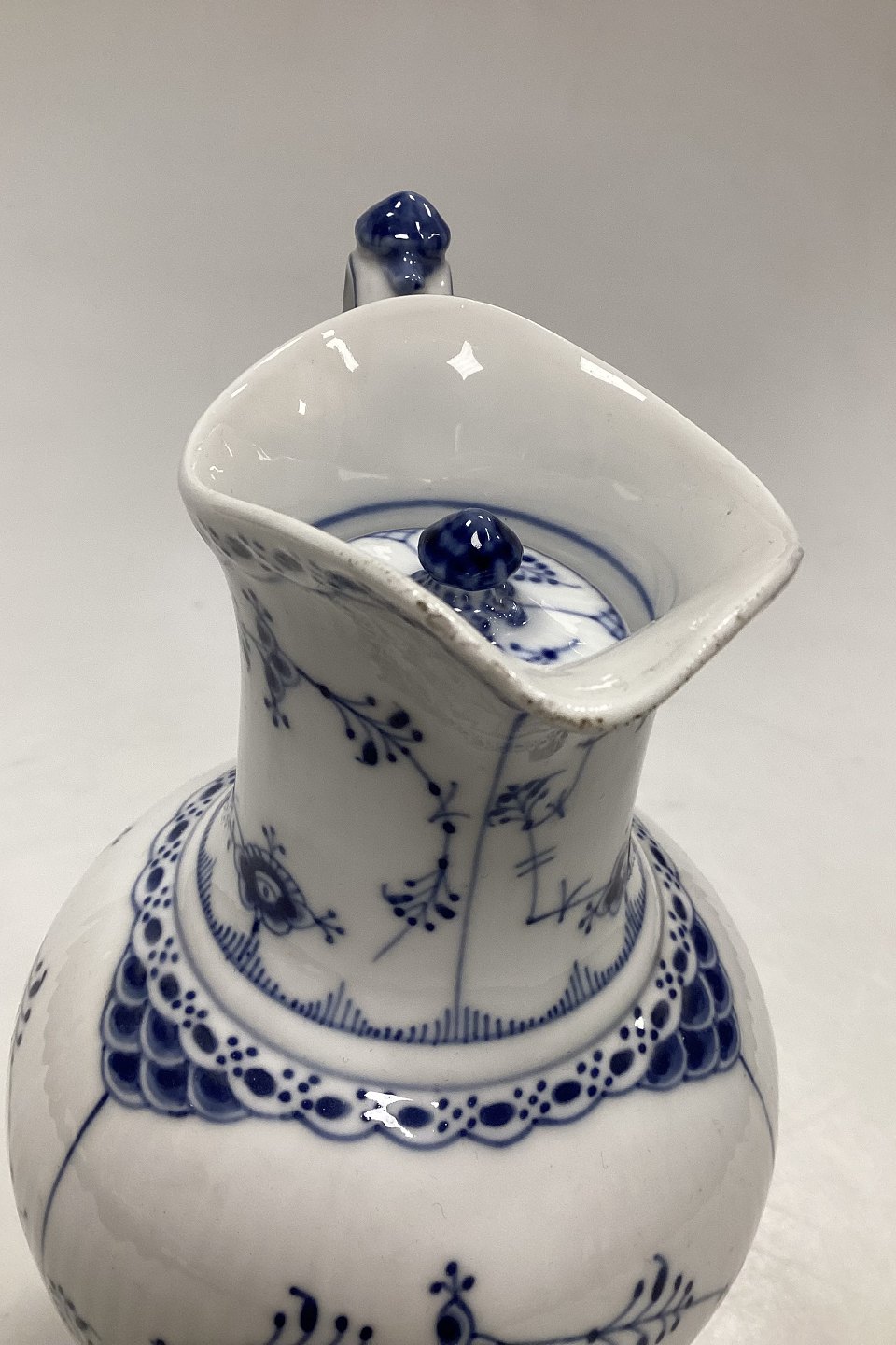 Royal Copenhagen Blue Fluted Half Lace Chocolate Pot No 722. Measures 23 cm / (9 1/16 in.). Has burn marks / chips on the sprout of the pot. See pictures