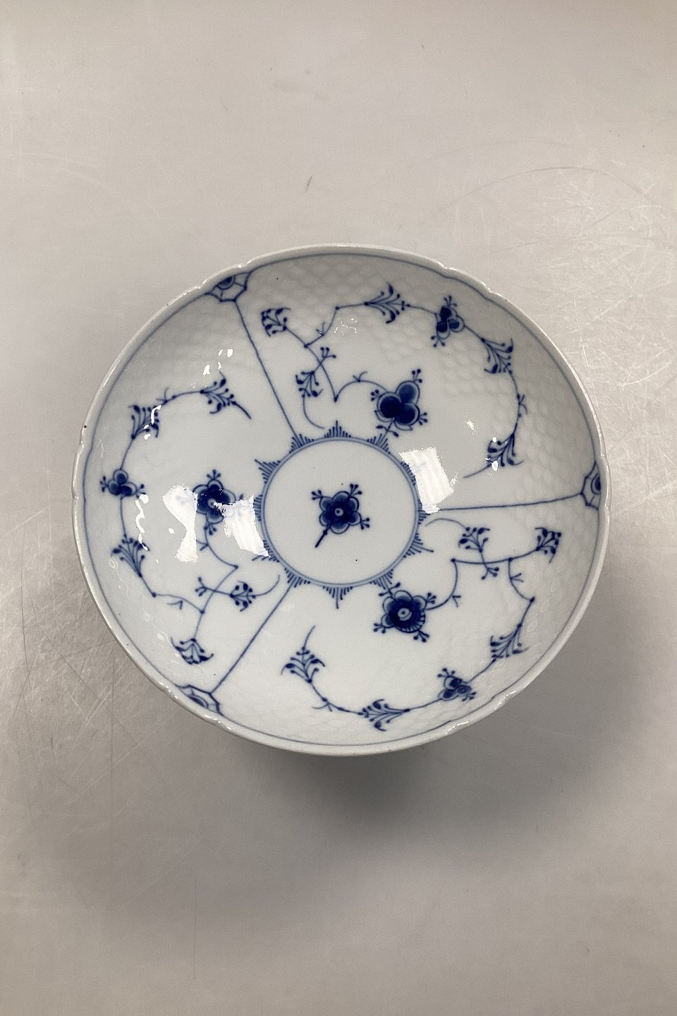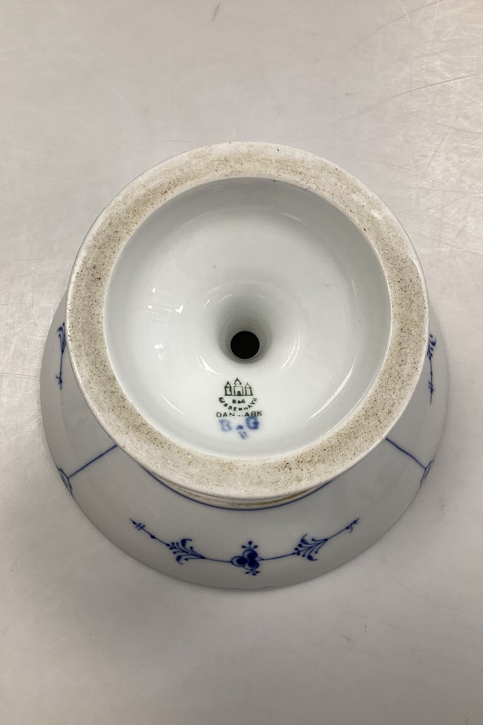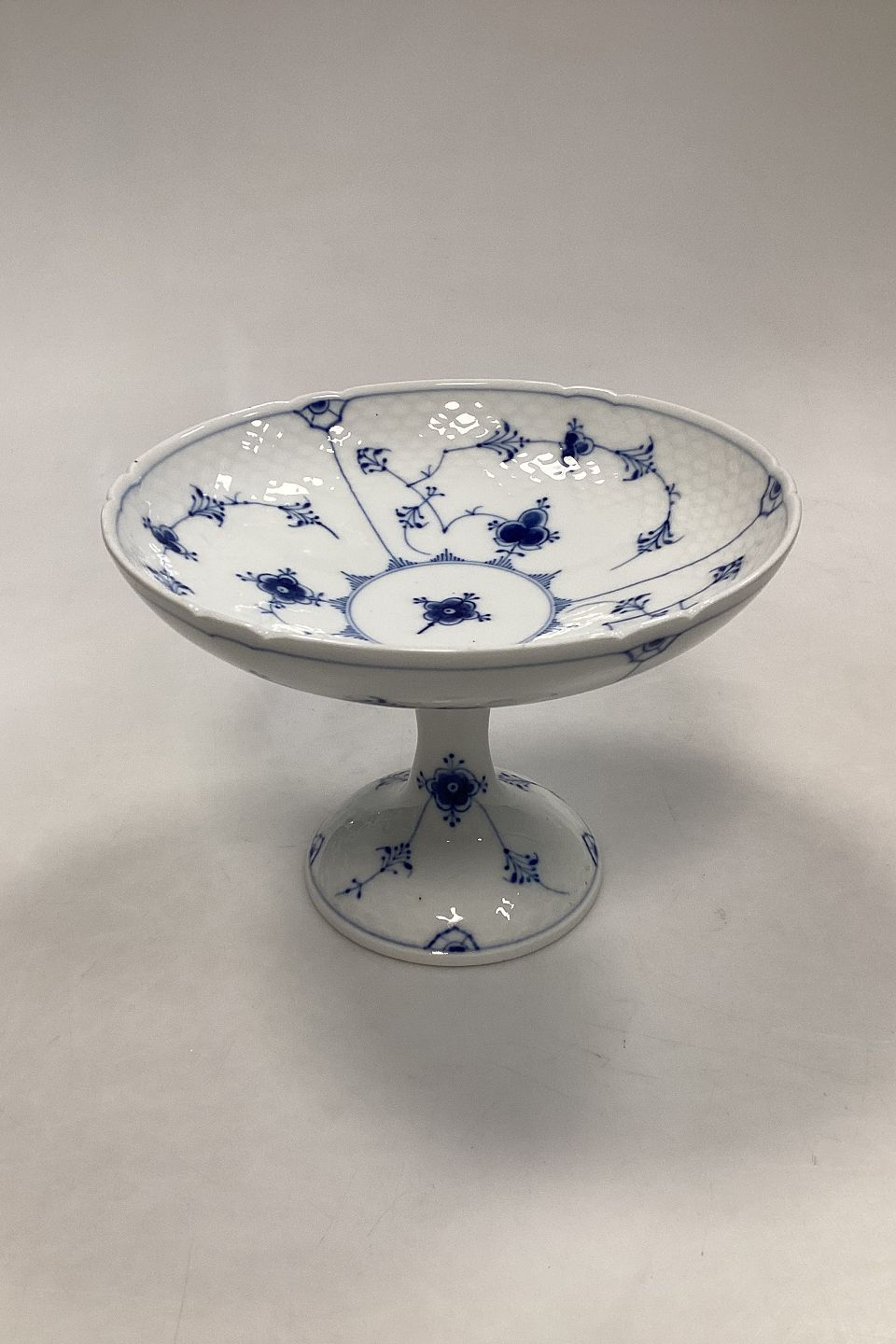 Bing og Grøndahl Blåmalet Musselmalet Opsats/Frugtskål No. 64. Måler 20 cm i dia og 14,5 cm høj. I god stand, dog med nogle få små mørke brændingsmærker.