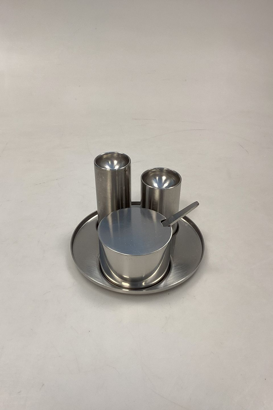 Indeholder Saltbøsse, Peberbøsse, og Sennepskrukke med låg og ske