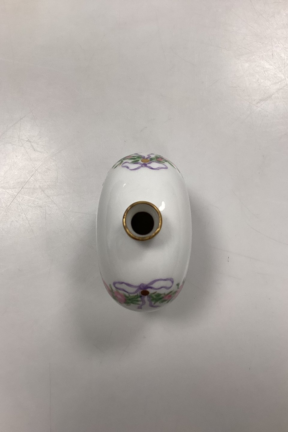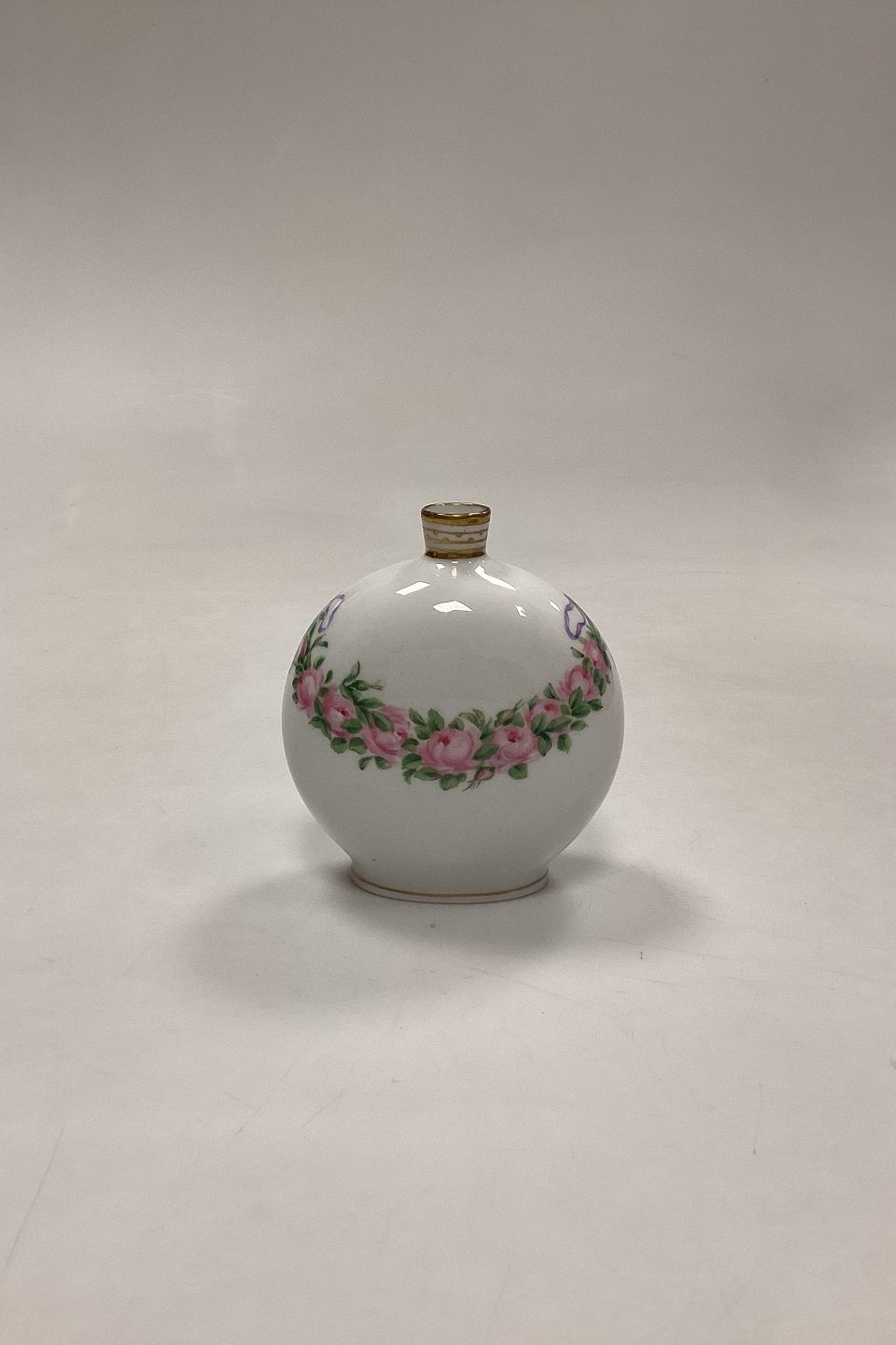 Royal Copenhagen Privately Painted Vase. Motif with pink rose garland. Inscription at the bottom: Christmas Eve 1906, GS. Measures 10 cm / 3.93 in.