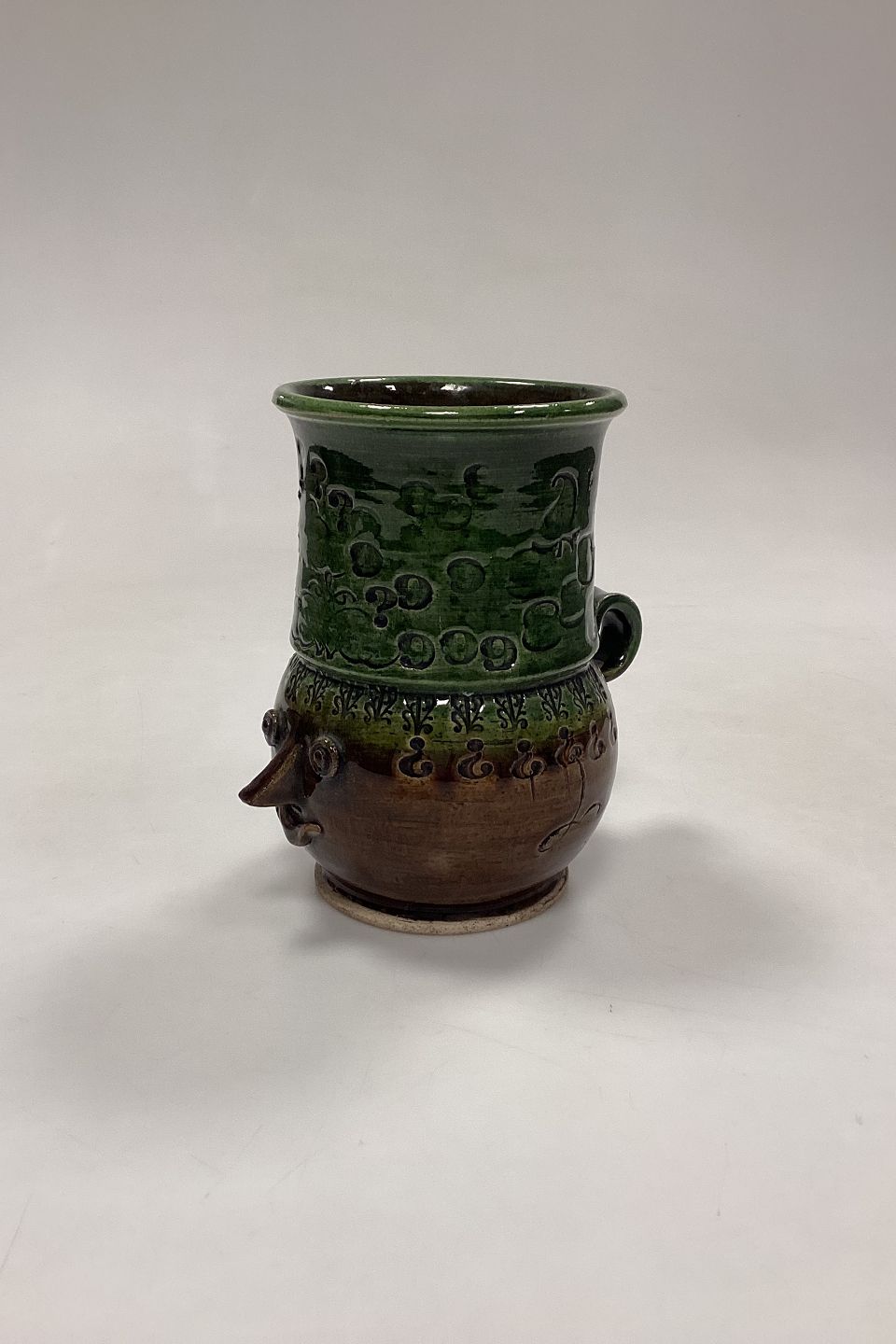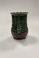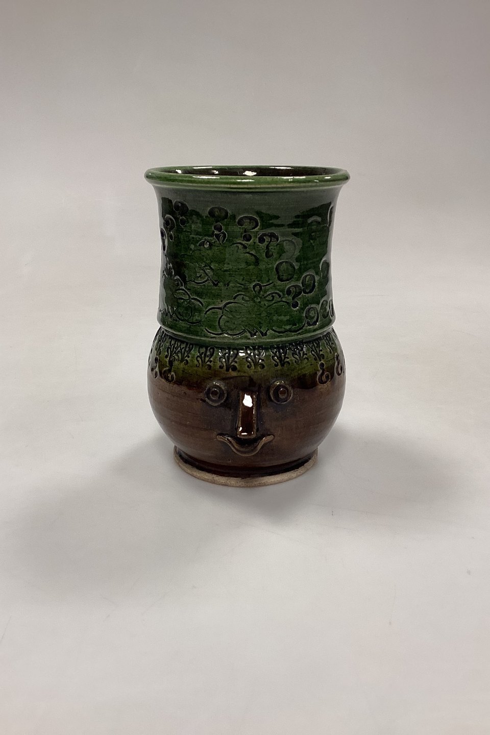 Bjørn Wiinblad Vase i glaseret Stentøj. Motiv med ansigt, hank og prægede stencilmønstre i brun og grøn glasur.